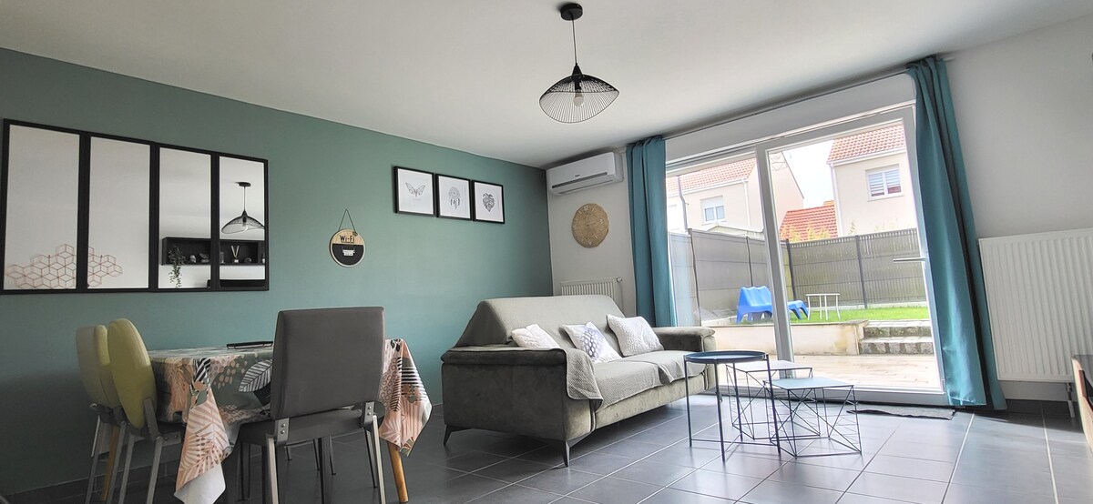 Charmante maison neuve tout confort, de 80m² avec jardin privatif clos, décorée avec goût. Vous y trouverez ce dont vous avez besoin, pour vous sentir comme chez vous Idéal pour séjours ou pour accueillir les salariés en déplacement à la semaine Entrée, avec une pièce ouverte donnant sur cuisine totalement équipée, séjour salle-à-manger(canapé d'angle,TV) table et chaises, fibre ,Netflix WC, machine à laver. A l'étage 3 belles chambres & salle de bain avec douche + WC Parking