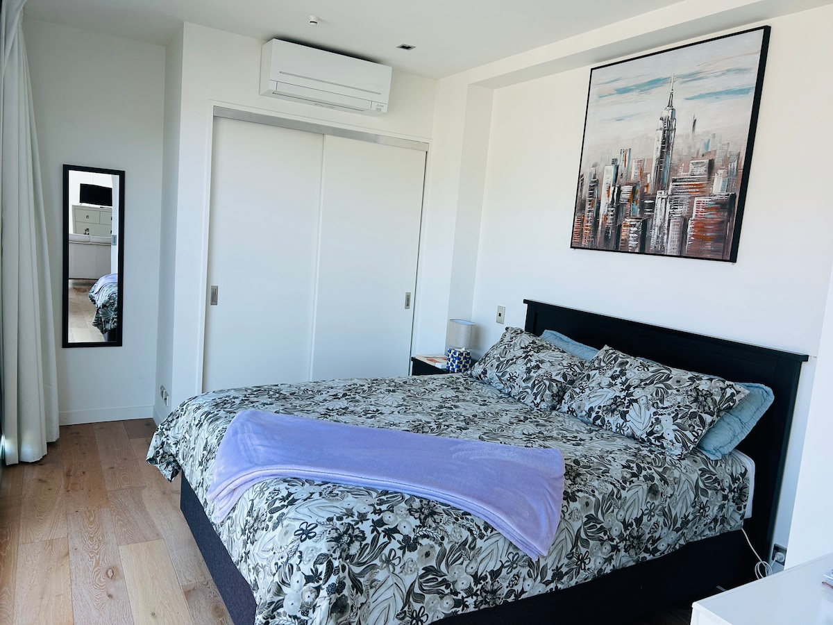 Heill dagur af ferðalagi kallar á afslappandi nætursvefn. Þetta einkasvefnherbergi var byggt fyrir nokkrum árum og býður upp á öll þægindin sem þarf til að slaka á og kalla það dag. Með nútímalegu baðherbergi, loftræstingu, barísskápi, snjallsjónvarpi og þægilegu queen-rúmi til að eyða kvöldinu í að horfa á YouTube eða streyma á tækinu þínu með ótakmörkuðu neti. Snertilaus inn- og útritun, hljóðlátar stillingar, nálægt flugvelli og hraðbraut.