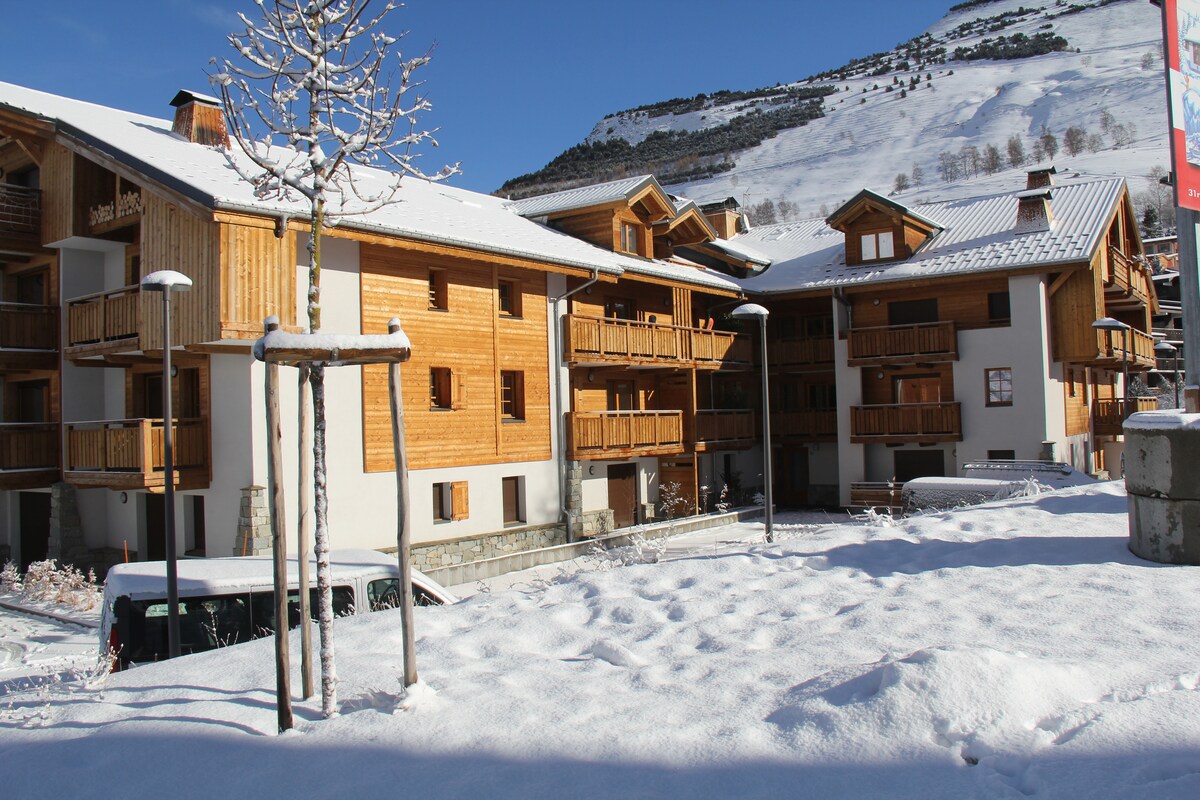 Nýlega uppgerð íbúð (26 m2) er 200 m frá snjóframhliðinni þar á meðal: - fullbúið eldhús: uppþvottavél , örbylgjuofn - örbylgjuofn, ketill, brauðrist, brauðrist, raclette vél, fondue vél, plancha , ofn, matvinnsluvél, kaffivél , framkalla helluborð . - Svefnpláss fyrir 6 (í svefnherberginu: eitt hjónarúm og 2 einbreið rúm , einn svefnsófi í aðalherberginu) - suður austur svalir með stórkostlegu útsýni yfir Meije og 2 Alpana. Lín til heimilisins er ekki innifalið.