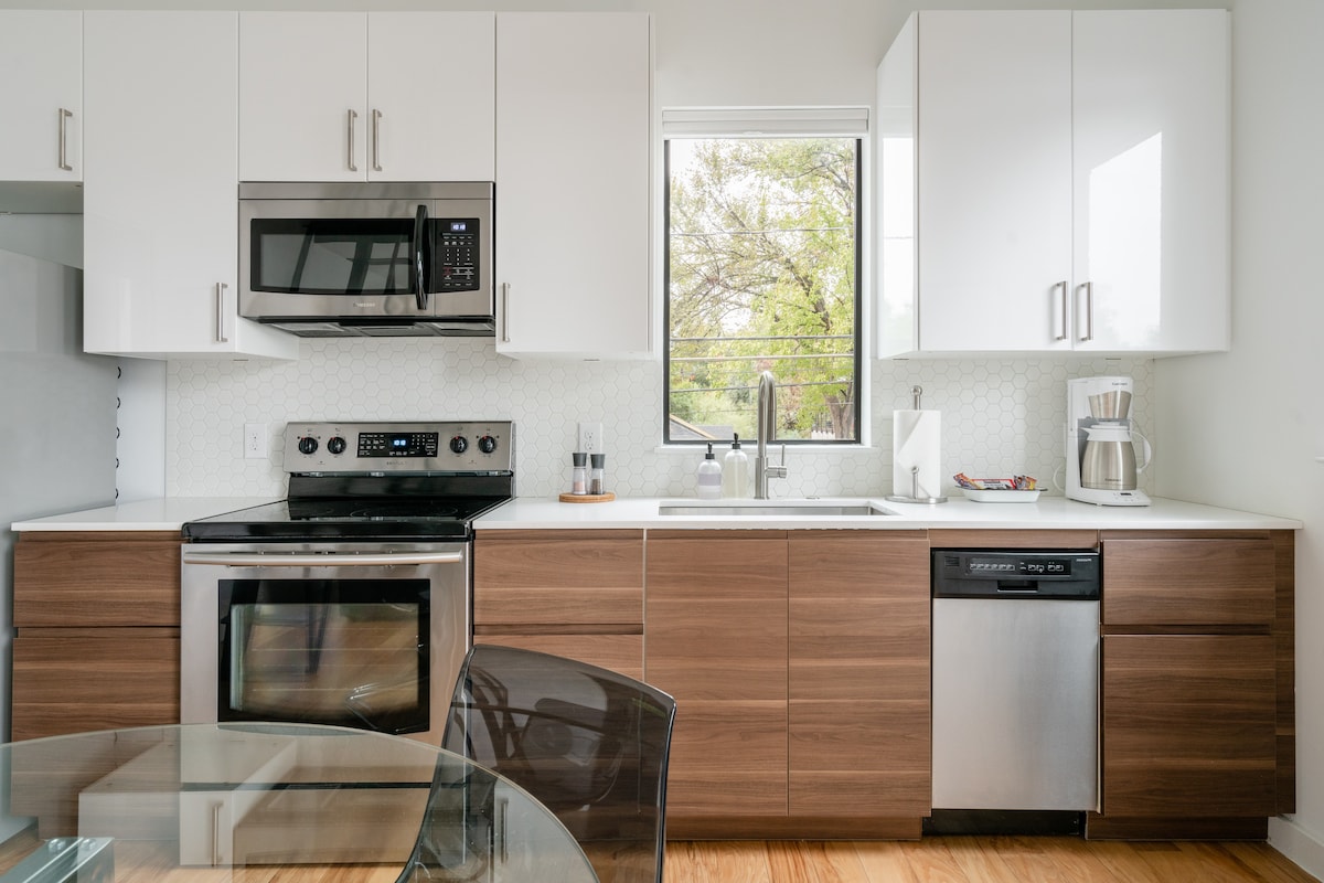 Glænýr sænskur nútímalegur griðastaður - fullkominn staður til að skoða Austin. Gakktu að stöðum í miðbænum og á Austurvelli, matarbílum, börum, skutlum, hjólastíg og Town Lake. Svefnpláss fyrir 4, góð verönd fyrir morgunmat og happy hour, þráðlaust net, miðlægur hiti/loft, hljóðlát blokk, þvottavél/þurrkari. Glæsileg viðarinnrétting, yfirgripsmikið loft með þakglugga til að skoða tré og dagdrauma. Einkainngangur að húsasundi með sérstöku bílastæði utan götunnar; öruggt aðgengi að talnaborði. Mörg þægindi!