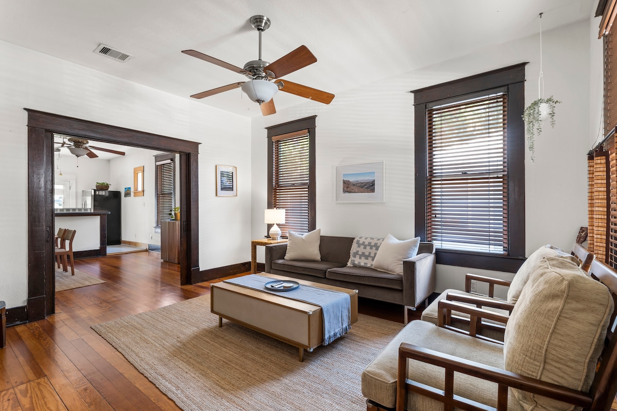Style meets functionality at our tranquil retreat with modern furnishings, original artwork, and lots of natural light. Cook in a sleek custom kitchen and dine at a cozy live-edge table. Sip specialty coffee and crack open a book in a charming screened porch. Walk to neighborhood favorites and downtown hot spots. Delight in thoughtful architecture, skillful use of reclaimed building materials, and furniture made by local artisans. Find everything you need for business travel or exploring Austin.