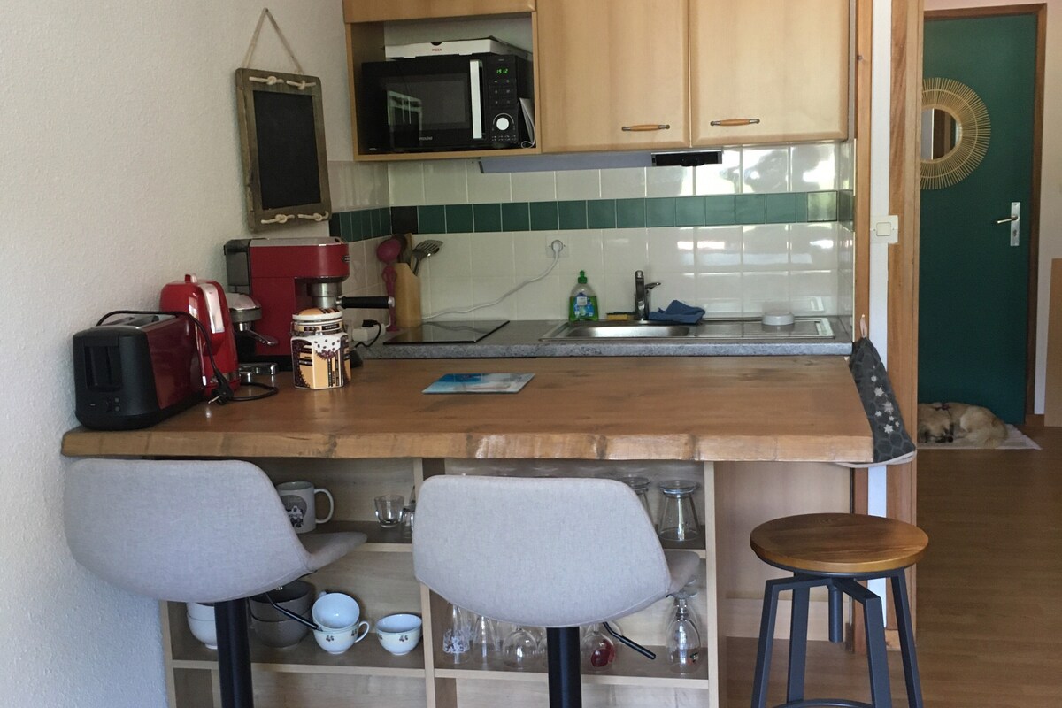 Studio à la montagne en plein cœur du village. Cabine avec lit superposé. Cuisine totalement équipée (frigo, four micro onde grill, Machine expresso Delonghi, grille pain, bouilloire, raclette) Salon avec canapé-lit neuf, TV HD 98cm, rangements, jeux , livres. Prévoir linge de lit et de toilette. Balcon exposé ouest. Au centre du village. Proche des pistes de ski (foyer ski de fond à 200 mètres) et des commodités. Casier à skis et local à vélos.