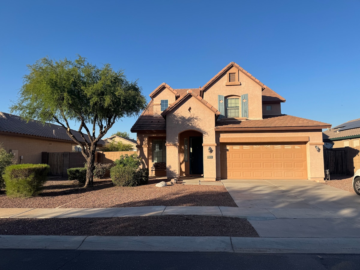 Kynnstu friðsæld fallega heimilisins okkar. Afslappandi eign við vatn með þremur svefnherbergjum og tveimur baðherbergjum, fullkomin fyrir fjölskyldu. Staðsett í rólegri blindgötu, nálægt göngustígum, hjólaleiðum og vatninu. Njóttu frítíma með flóknum spilakössum við sundlaugina. Nálægar áhugaverðir staðir Dodgers, Whites Sox, Brewers, West Gate, Diamond Casino, Cardinals Stadium, Desert Diamond Arena og Phoenix International Raceway. Þetta er heimili þitt að heiman. Bílskúr með pláss fyrir 2 bíla. myndavél með hringitón við útidyr