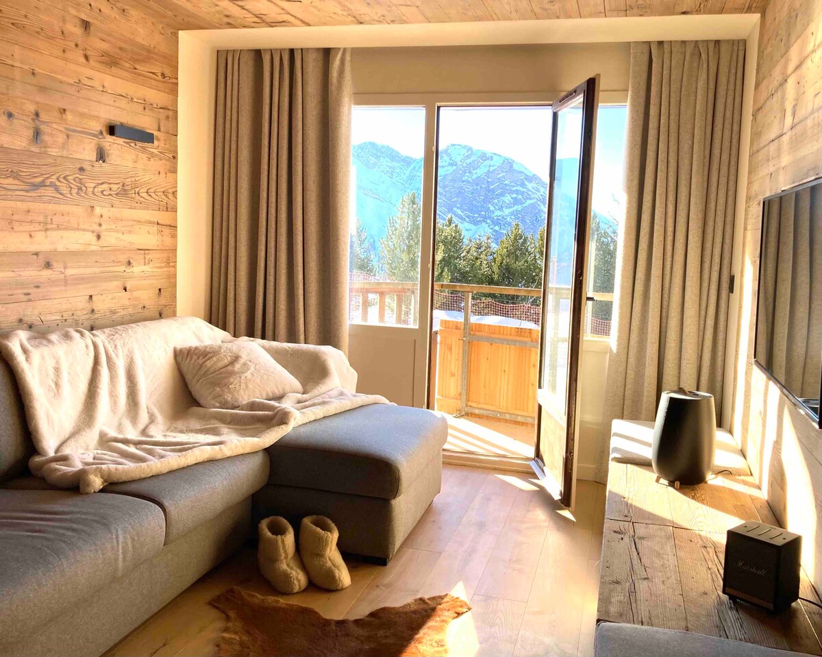 Vertu hátt uppi í notalegu, björtu 62m2 íbúðinni okkar sem var endurnýjuð að fullu árið 2024. Notalegt andrúmsloft og yfirgripsmikið útsýni yfir dvalarstaðinn frá tveimur sólríkum svölum. Hægt að fara inn og út á skíðum. Ný þægindi og vönduð rúmföt. The Aster residence is located in the Crozats district, on the heights of the resort, quiet assured but animation and shops accessible by 2 elevvators. Fjölskylduíbúð, leikir og bækur. Hitastig og hljóðeinangrun ++