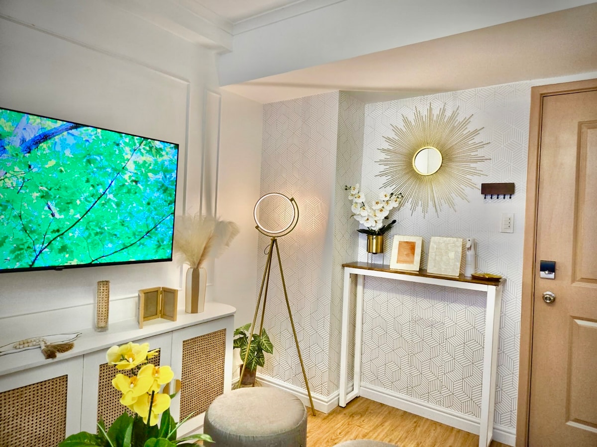 Gistu í stílhreinni, innanhússhannaðri hitabeltissvítu með ÓTRÚLEGU OG ÓHINDRAÐU BORGARÚTSÝNI í Knightsbridge Residences, 5-stjörnu íbúðarbyggingu miðsvæðis í Poblacion. Njóttu þessarar íburðarmiklu 40 fermetra svítu sem er RÚMMEIRI en flestar 20 fermetra Airbnb eignir á svæðinu. Staðsett á 37. hæð með 5-stjörnu þægindum, fullbúnu eldhúsi, svölum og öllu sem þarf fyrir fullkomna dvöl: 200 Mbps ljósleiðsluþráðlaust net, Netflix, 43 tommu sjónvarpi, sundlaug í alþjóðlegri stærð, nútímalegri ræktarstöð, gufubaði og einkaþjónustu allan sólarhringinn