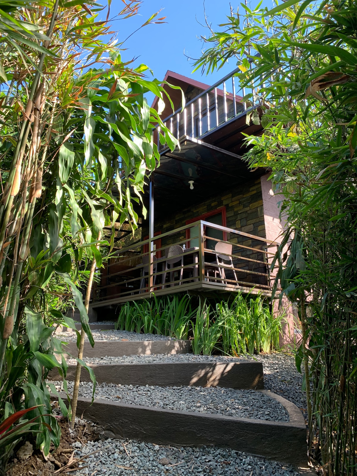 Gestahúsið okkar er á einkabýli sem við köllum bóndabýli Nana. Hann var haganlega byggður og hannaður með gesti okkar í huga. Vinsamlegast lestu umsagnir okkar. Þessi svíta er á allri annarri hæðinni. Rúmgott svefnherbergi, baðherbergi með baðkeri, stofu, eldhúskrók og svölum. Það er með sérinngang og deilir ekki göngum með svítunni á jarðhæð. Á býlinu í heild sinni er aðeins eitt gestahús sem er aðskilið í tvær svítur og snýr út að görðunum. Öflugt þráðlaust net frá PLDTFibr.