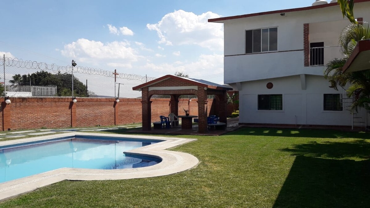 Fallegur bústaður í niðurhólfuninni með öllum þægindum. Frábær staðsetning í 20 mínútna fjarlægð frá miðbæ Cuautla. Sundlaug með katli (valfrjálst), vatnsbar, grillsvæði, tveimur stórum görðum, bílastæði, hröðu þráðlausu neti og nauðsynlegum þægindum fyrir alla fjölskylduna í rýmum sem eru hönnuð fyrir börn og fullorðna. Taktu vini þína eða fjölskyldu saman, deildu kostnaðinum og þú munt sjá að þetta er frábært verð! *Mælt með fyrir 8 gesti og áfram.