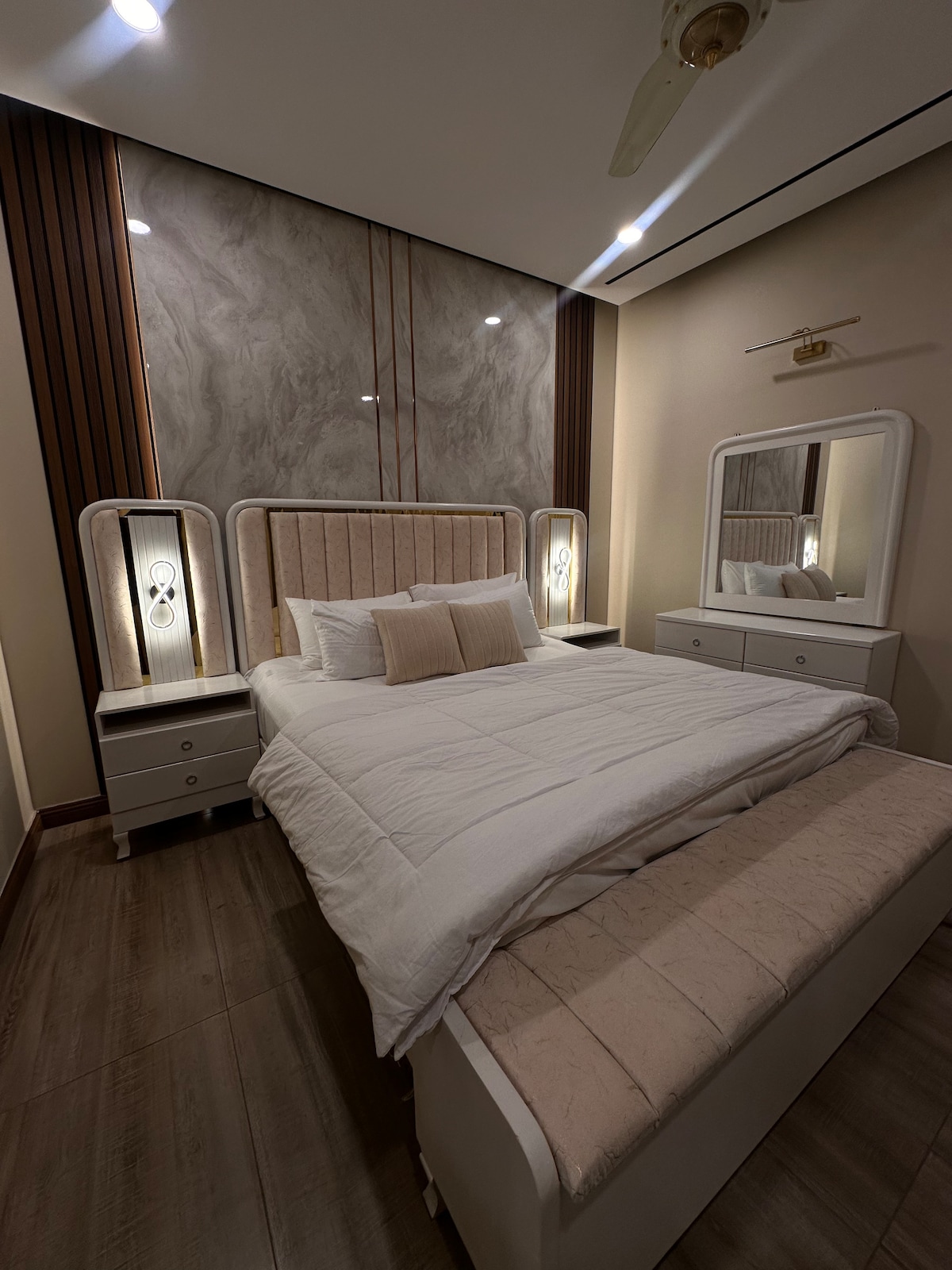 Welcome to The Royal Residence—A Stylish and modern living experience, located in Bahria Town, Rawalpindi, this stylish apartment features a subtle living area, a kitchenette, and a comfortable queen-sized bed for a relaxing stay. Living Perks ⦿24/7 heating & cooling (inverter) ⦿Free Snacks ⦿Balcony Location Perks ⦿1 minute walk to KFC, McDonald’s, Subway, Pizza Hut and all famous food chains. ⦿Secure building with 24/7 security *Only for friends and families* *Unmarried Couple Not Allowed*