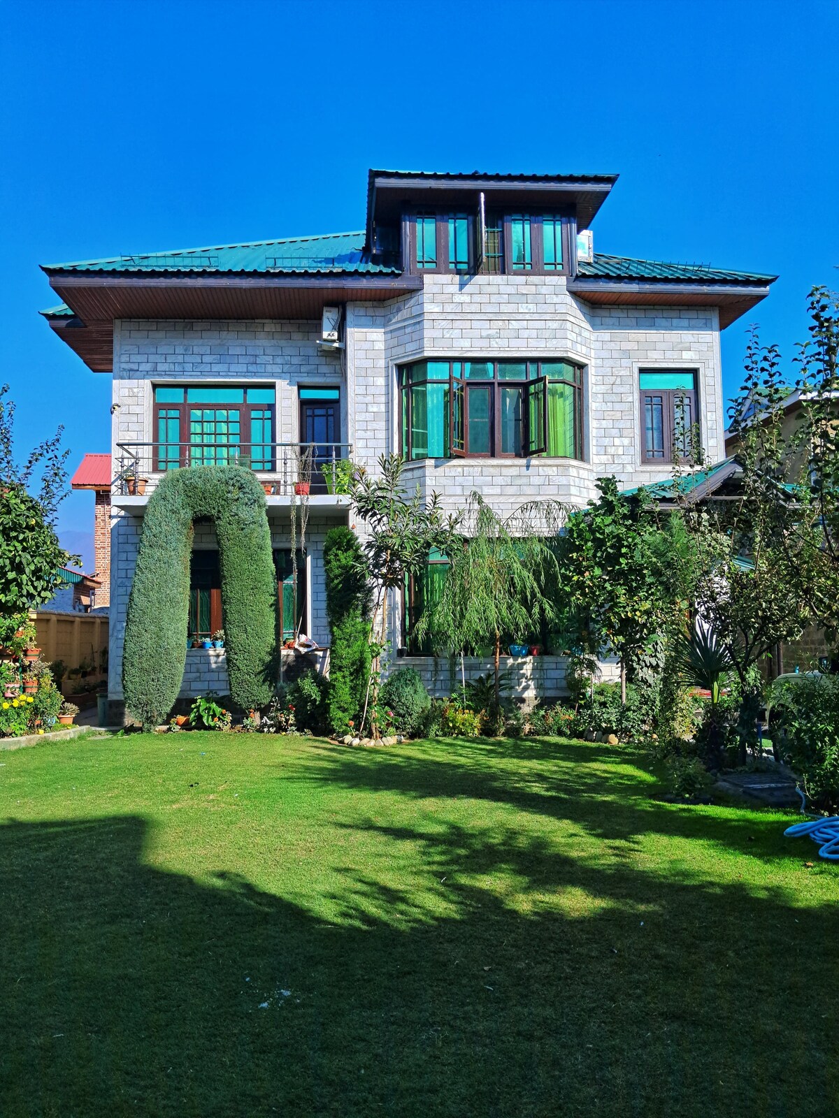 Wake up to beautiful views of the Gulmarg mountain range from this serene cottage set on over an acre of private, walled land. Surrounded by a terraced garden filled with local fruit trees and flowers, it offers a calm, healthy retreat away from the city. Enjoy table tennis, a gym room, ample free parking, and easy access to public transport. Perfectly located for Gulmarg, Sonmarg, and Pahalgam, just 35 minutes from Lal Chowk, with a fully equipped kitchen or convenient home delivered meals.