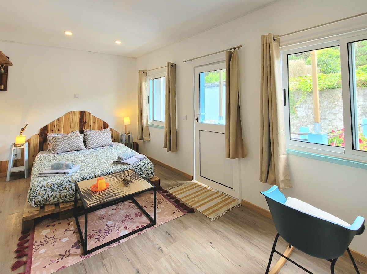 Þetta notalega og glæsilega stúdíó, sem er staðsett á rólegu svæði, er í göngufæri frá helstu náttúrulegu kennileitum Furnas og er búið öllu sem þú þarft til að eiga ógleymanlega upplifun og uppgötva einn af ótrúlegustu stöðum sem þú munt nokkurn tímann heimsækja... Þetta er fullkominn staður fyrir pör (með allt að 2 börn) eða vinahóp sem á ekki í neinum vandræðum með að deila sama herbergi.