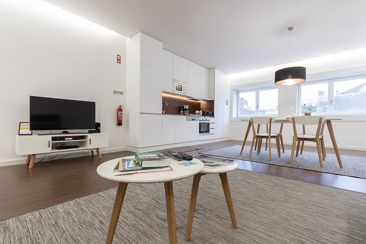 Íbúð T1 með 68m2 á besta stað Viana do Castelo. Ég mæli með því að þú skoðir myndirnar til að fá hugmynd um rýmið og dreifingu þess. Hún er með innra rými með tvíbreiðu rúmi og tveimur einbreiðum rúmum í stofunni. Það er staðsett fyrir framan skipið Gil Eannes í Largo Vasco da Gama, í hjarta borgarinnar. Mjög rólegt svæði sem veitir þá hvíld sem þú vilt. Íbúðin er í byggingu sem snýr að Lima-ánni og er með fallega framhlið. Staðurinn er nýr, hann var byggður frá grunni árið 2019.