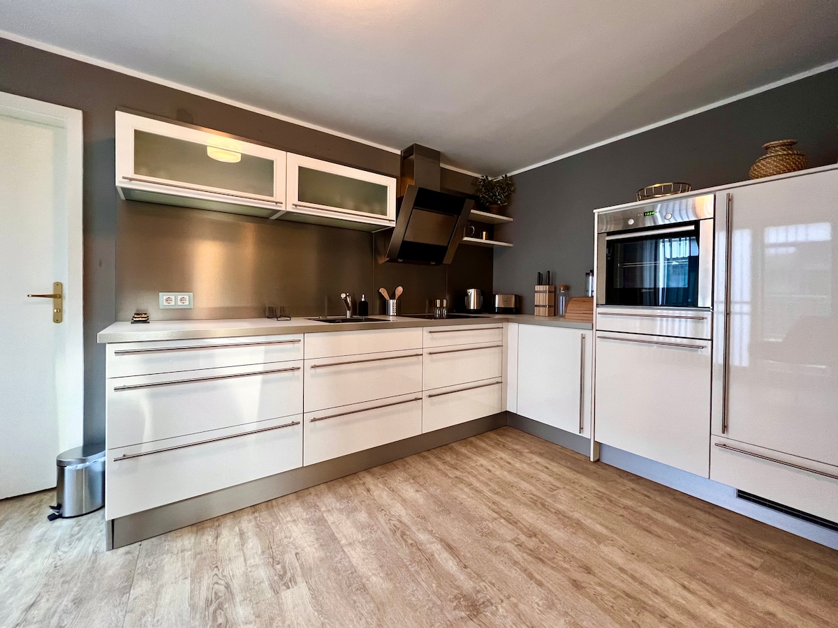 * Myndlegt víngarðshús með frábæru útsýni yfir landsbyggðina * Róleg staðsetning í útjaðri Bad Sulza, rétt við Ilmradweg * Spa-garður og aðstaða, hitaveita í Toskana, útskriftarverksmiðja, sundlaug utandyra, víngarðar, stórverslun og lestarstöð aðeins mínútna gönguleið * Notalegt stofueldhús með flatskjávarpi, þráðlaust net og stórar svalir * svefnherbergi á oddhæð með 2 einbreiðum rúmum, mögulegt 3. aukarúm * baðherbergi með sturtu og salerni í sérstökum viðbyggingum * séreign, strangt hreinlæti, sveigjanleg afbókun