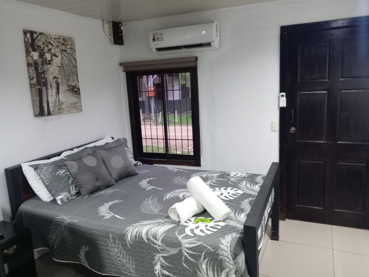 Estamos ubicados a 500 mts de la entrada al Parque Nacional Marino Ballena, ofrecemos un apartamento totalmente equipado para 1 o 4 personas con finos acabados, completamente seguro y acogedor . incluye sala, cocina completa, baño, dos habitaciones con una cama Queen cada una, aire acondicionado, televisión con servicio streaming y WIFI gratis de fibra óptica, también contamos con piscina y parqueo gratis y seguro.