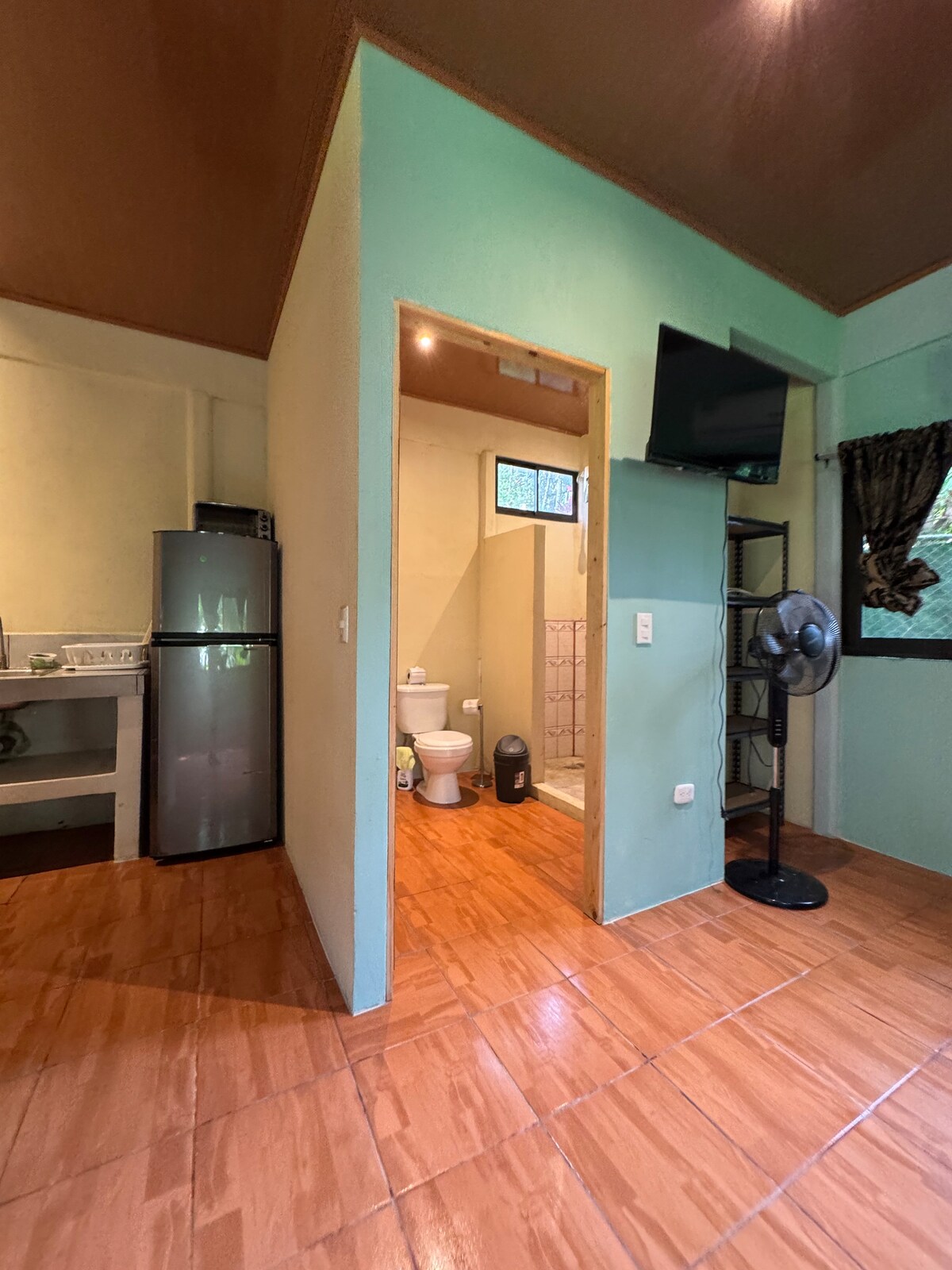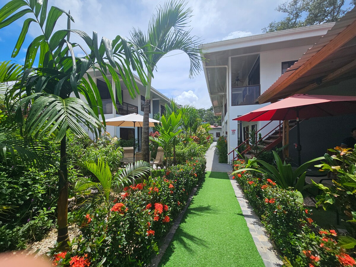 1 double bed, air conditioning, cooking utensils, pots, cutlery, table and chairs on terrace, colorful decoration, safety box and WiFi. Private bathroom has a hot water shower. Unit is upstairs. Access to private parking lot and use of tropical garden and patio. Secured front gate, laundry and restaurant across from parking lot. Property is inside the beach town of Dominical. 1 minute walk to the beach and 5minute to town center. Staffed friendly reception 8-6pm for activity info & book tours.
