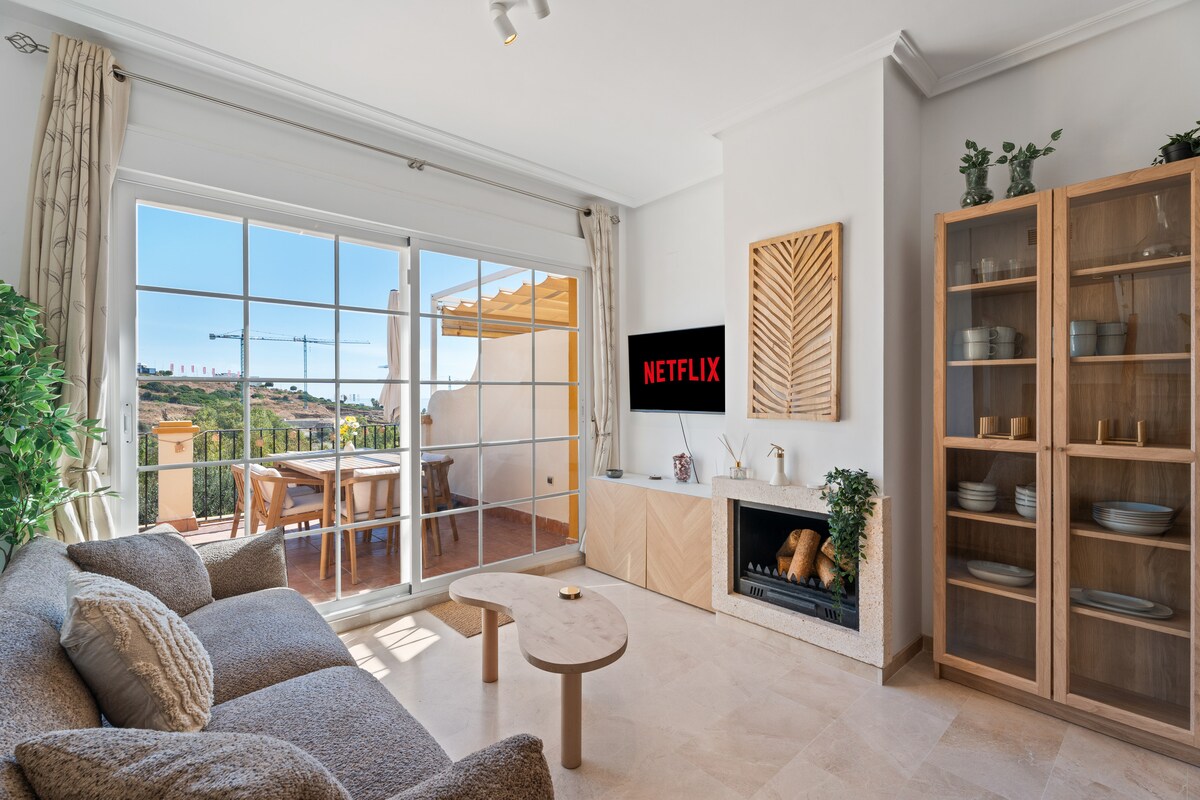 Velkomin í bjarta og notalega þakíbúðina okkar í bóhemstíl á tveimur hæðum sem er staðsett í friðsæla þéttbýlinu Jardines de Casares — rólegu svæði umkringdu náttúru og í stuttri göngufjarlægð frá ströndinni. Þetta heimili er fullkomið til að slaka á, snæða utandyra eða njóta sólríkra morgna í algjörri næði þar sem það er með tvær rúmgóðar veröndir sem bjóða upp á víðáttumikið sjávar- og fjallasýn.