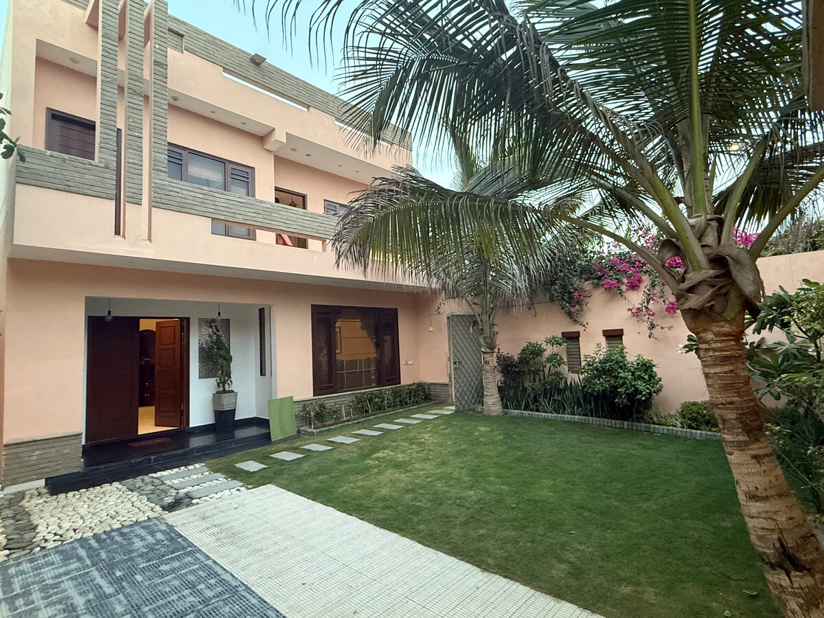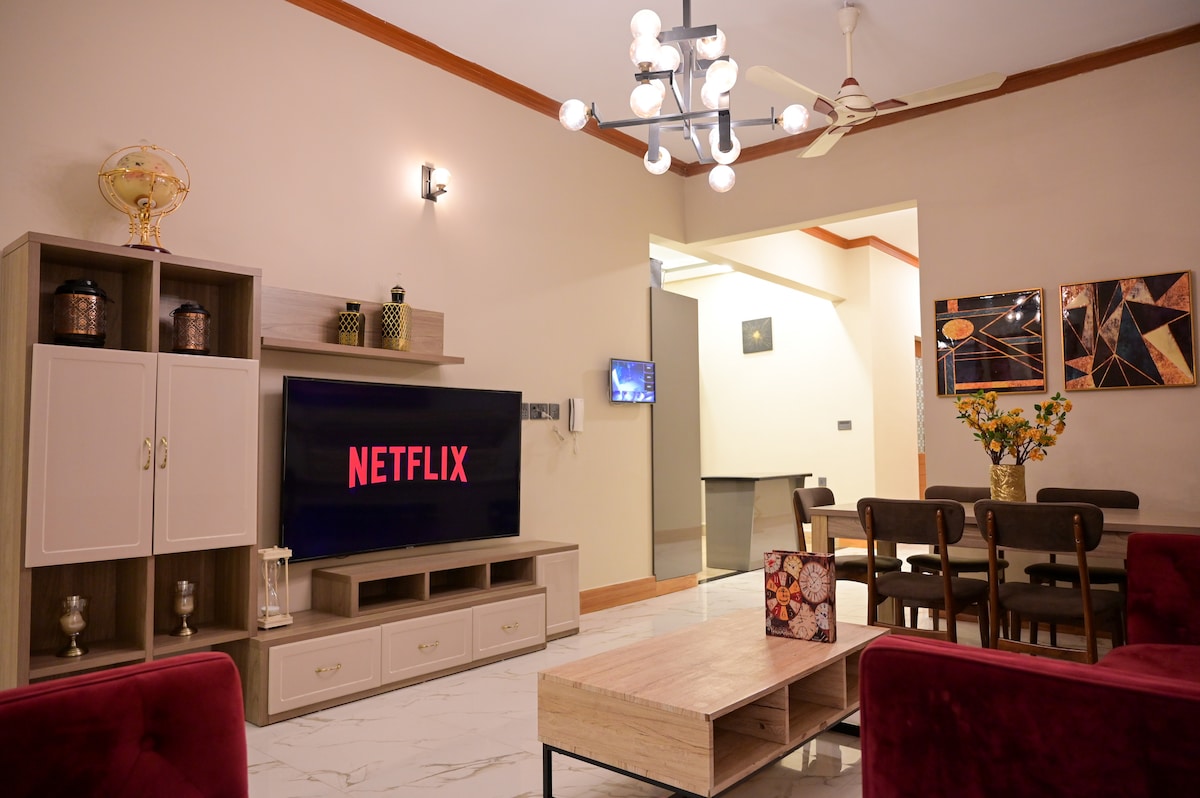 Verið velkomin á rúmgóða 200 fermetra heimilið okkar á fyrstu hæð með 2 loftkældum svefnherbergjum með aðliggjandi baðherbergjum, notalegri stofu, setustofu með borðstofuborði og sjónvarpsvegg, fullbúnu eldhúsi og svölum með friðsælu útsýni. Í Gulshan-e-Iqbal Block 7 finnur þú matarkeðjur, almenningsgarða, moskur, matvöruverslanir, læknaverslanir og bakarí í nágrenninu. Þjónusta umsjónaraðila allan sólarhringinn tryggir snurðulausa dvöl. Tilvalið fyrir fjölskyldur eða viðskiptaferðamenn! Kveðja Faisal Akhlaq