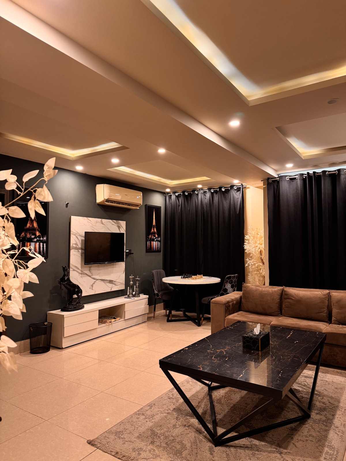 Stígðu inn í Moonlight Noir sem er glæsilegt tveggja svefnherbergja afdrep með tunglsljósi. Njóttu flottrar setustofu, úrvalseldhúss og notalegra svefnherbergja sem eru hönnuð fyrir stíl og þægindi. Fáðu aðgang að bestu þægindunum, þar á meðal sundlaug, líkamsræktaraðstöðu og öruggu bílastæði. Fullkomið fyrir viðskipta- eða frístundagistingu í Lahore. Upplifðu lúxus, stemningu og kyrrð — allt undir sama þaki. Auðvelt í þessu einstaka og friðsæla fríi.