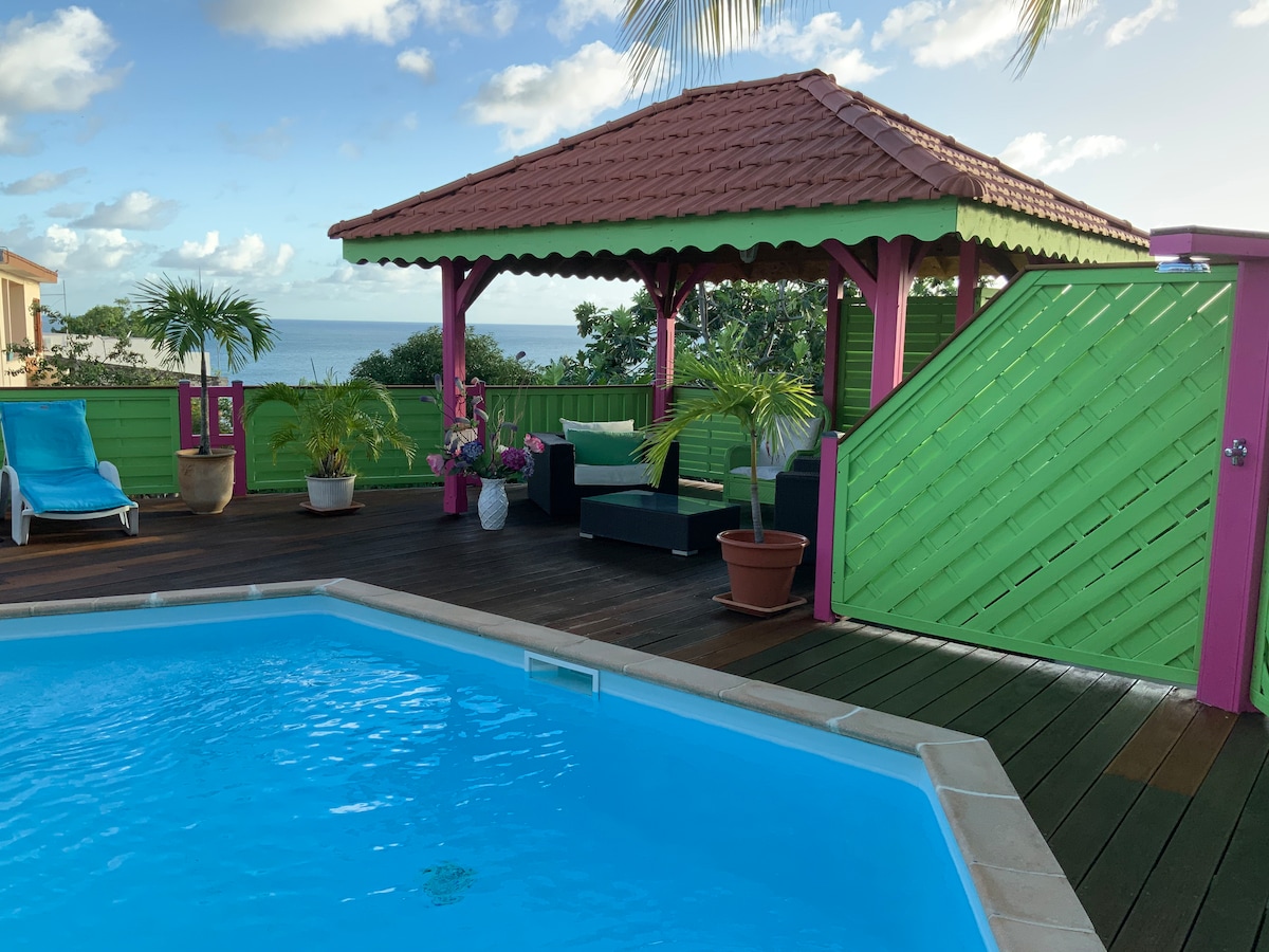 Magnifique Villa, située sur les hauteurs de Sainte Luce, et proche de la plage Elle comprend 2 chambres Climatisées (lits doubles) + dressings + 2 salles de bain, piscine privée (sécurisé par alarme et barrière) Vue panoramique à 180 degrés sur la Mer des Caraïbes, et jardin. Nichée en pleine nature, vous profiterez du chant des oiseaux et du jardin. Aucun vis à vis. A 5 min de la plage de et des commodités (Carrefour express, pharmacie, restaurant ). Capacité : 4 personnes + 1 bébé