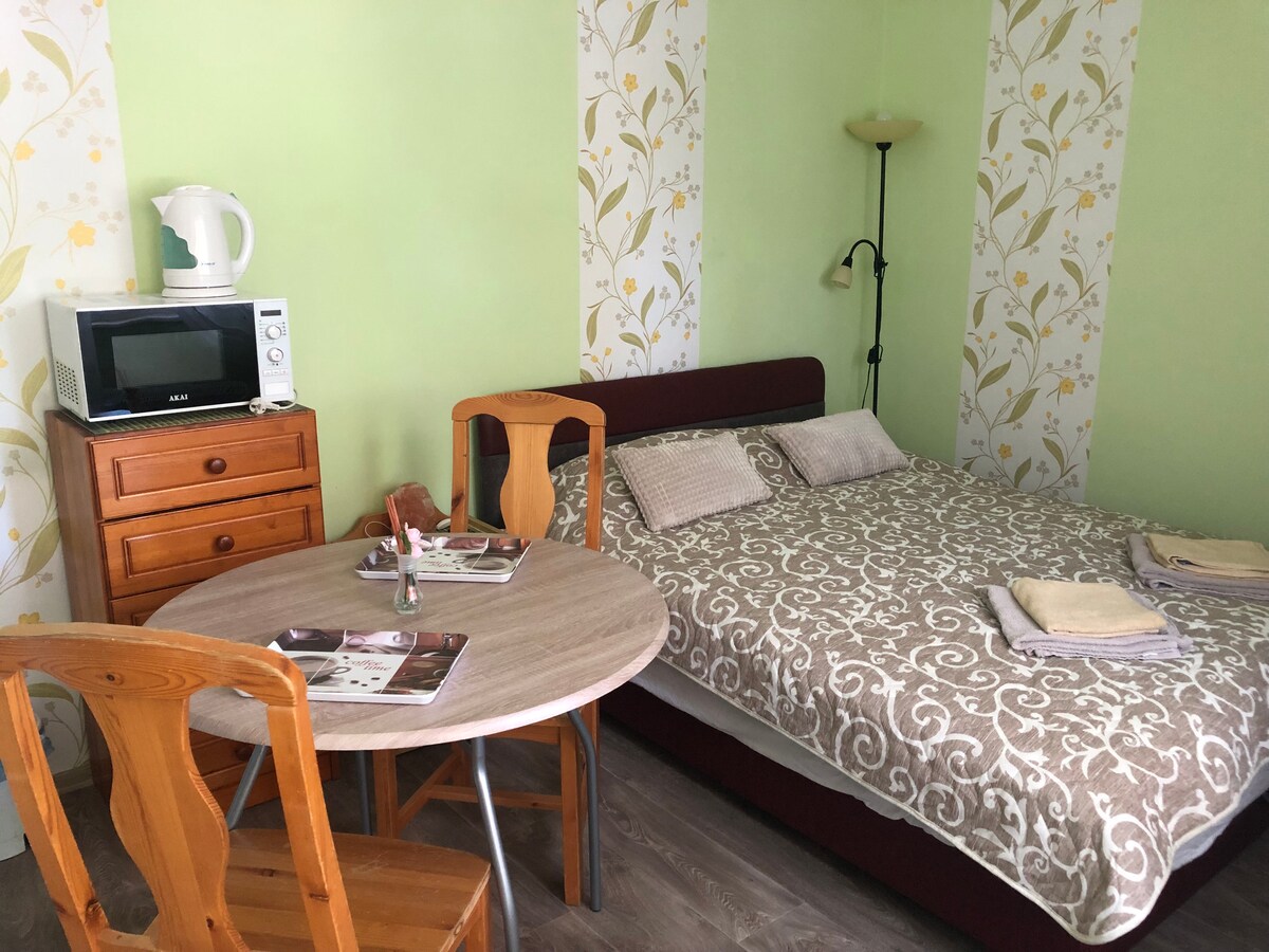 Þessi sérstaki staður er nálægt öllu og því er auðvelt að skipuleggja heimsóknina. Íbúðin er þægileg fyrir pör. Þetta er frábær valkostur fyrir afslöppun, frí eða jafnvel nokkurra daga samgöngur. Veröndin er með útsýni yfir garðinn þar sem er borðtennis, borðtennis og afdrep í garðinum. Hægt er að leigja reiðhjól með húseigandanum ef þess er þörf. Við tökum vel á móti gestum allt árið um kring.