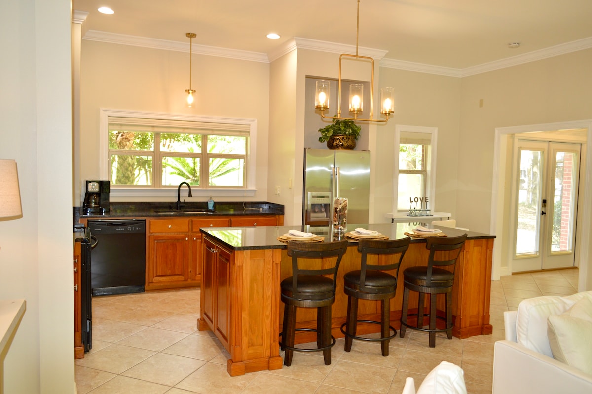 Fallegt hús með þremur svefnherbergjum og tveimur baðherbergjum á 0,4 hektara landi með girðingu í bakgarði, stórum eikartrjám, garðskála, stórri verönd, kolagrill og verönd að framan. Á heimilinu er eitt stórt hjónaherbergi og baðherbergi með fataherbergi, sturtu og nuddpotti. Á hinni hlið hússins eru 2 svefnherbergi, skrifborð/vinnusvæði og fullbúið baðherbergi. Í miðju húsinu er stór opin stofa, borðstofa og eldhús. Gæludýravæn (engir kettir) gegn 50 Bandaríkjadala gjaldi fyrir gæludýr. Göngufæri frá diskagolfvelli og ísbúð.