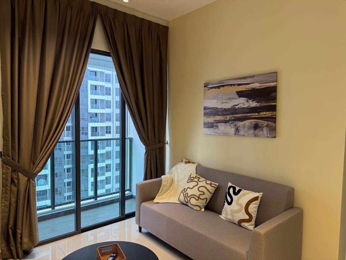 Upplifðu úrvalslíf með einstakri faglegri innanhússhönnun í þessari nýinnréttuðu eign. Öll þægindi í svefnherberginu eru glæný fyrir þig. Meðal afþreyingarvalkosta eru sjónvarp með YouTube, Netflix og Atari-leikjasett. Njóttu glæsilegs útsýnis á miðri hæð sem snýr að The Cube og IOI RIO. Þetta húsnæði er vel staðsett í hjarta Puteri Puchong og er í göngufæri við Coffee Bean, Starbucks, McDonald's, þvottaþjónustu, matvöruverslanir og fleira.