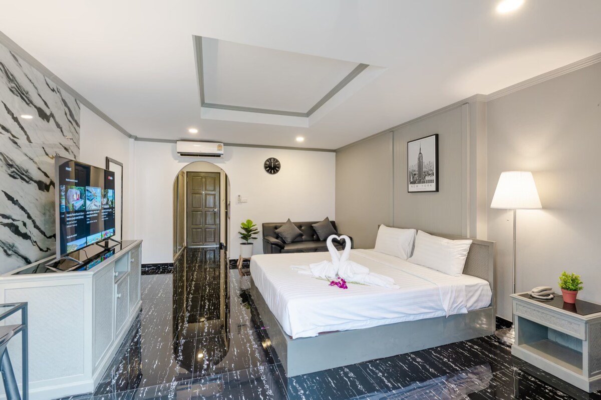 Þjónustuíbúð er staðsett við aðalgötu Pratumnak-hæð, besta íbúðarsvæðið í Pattaya ( kyrrlátt, gott útsýni ,5 mín að göngugötu, borgargarður og besta hlaupabrautin rétt fyrir aftan plc-ið okkar). Þú munt falla fyrir risastóru nútímalegu 200 fermetra nútímalegu lúxuseigninni okkar. Við erum aðeins með 6 einingar. Allar einingar sem við erum með einkaeign í Jagucci á svölunum, lítið eldhús fyrir létta eldun þegar þörf er á, þvottavél, þráðlaust net, kapalsjónvarp o.s.frv. Auk þess kostar ekkert að þrífa tvisvar í viku svo að herbergið sé hreint og þægilegt. Við erum einnig með stóra sundlaug allan sólarhringinn. Bókaðu núna