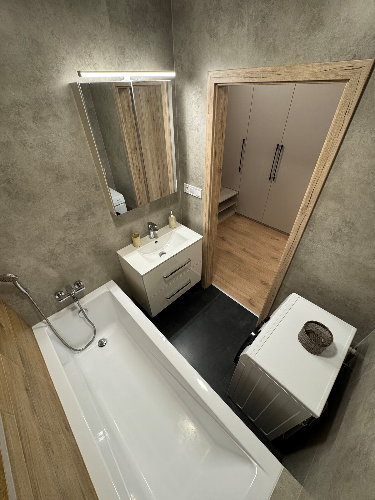 Þegar þú bókar 2 nætur eða lengur, freyðivín/vín! Taktu þér frí og slakaðu á í þessum vin friðarins. The 60m2 apartment on the ground floor of a multifunctional house is the right choice if you want to step out of the stereotype while enjoy a quiet unisturbed environment and sleep in a luxurious king size double bed. Nútímalega innréttað rými smýgur skilningarvitin og lætur þér líða eins og þú sért sérstök/ur. Baðkerið á móti sjónvarpinu tryggir þér einstaka baðupplifun.