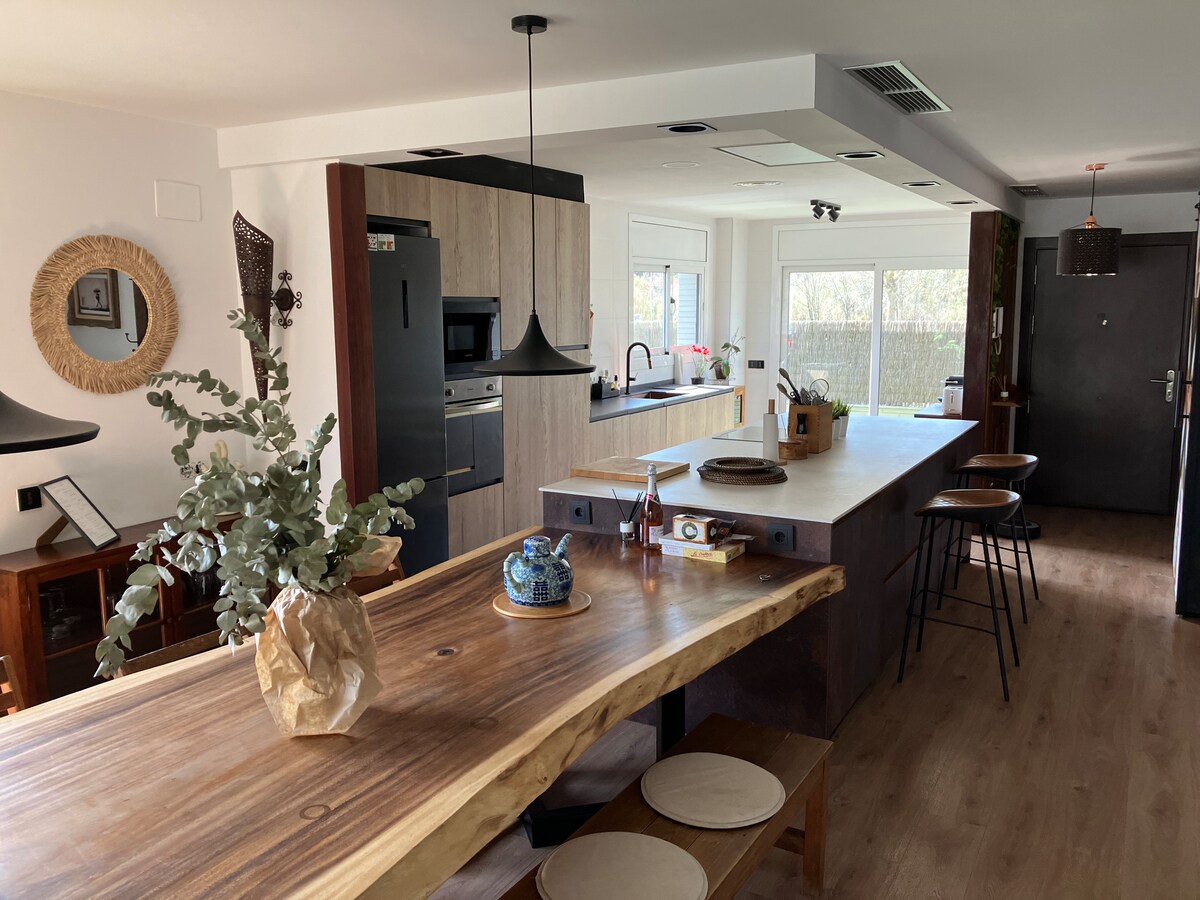 310m2 hús og 920m2 lóð með tveimur hæðum með bestu áferðum. 2 sjálfstæðar hæðir með 2 eldhúsum, 4 svefnherbergjum, 4 baðherbergjum, fullbúnu 20m2 ræktarstöð (swift hjóli), nýjum viscoelastic dýnum (king size) tónlistarbúnaði + 4K sjónvarpi (60") dolby atmos, heimabíó 130" sony 4K skjávarpa, leikstöð 5 og 4 fjarstýringum, mjög vel viðhaldið garði. Tilvalið fyrir fjölskyldur sem vilja pláss, kyrrð og öll þægindi í 15 mínútna fjarlægð frá Barselóna. Ókeypis úrval af kaffi, tei og eggjum.