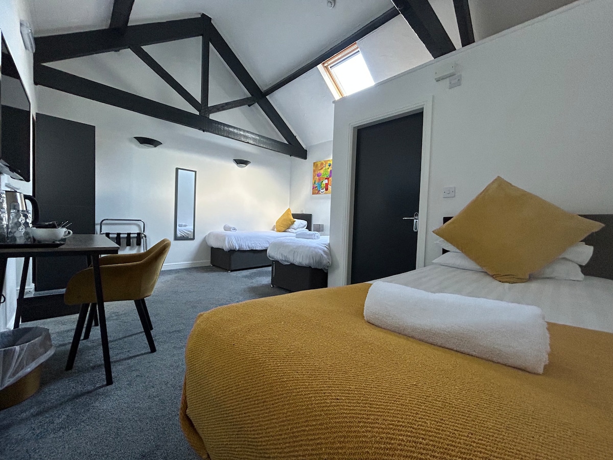 This room is suitable for 3 adults, or 2 adults 2 children. The price is based on 2 adults, an extra adult or child over 16 years is £20 extra, children 3-15 years are charged at £15 each, under 3 years are free. Cots are available for £5. Extra charges include breakfast, and are payable to the hotel on arrival.