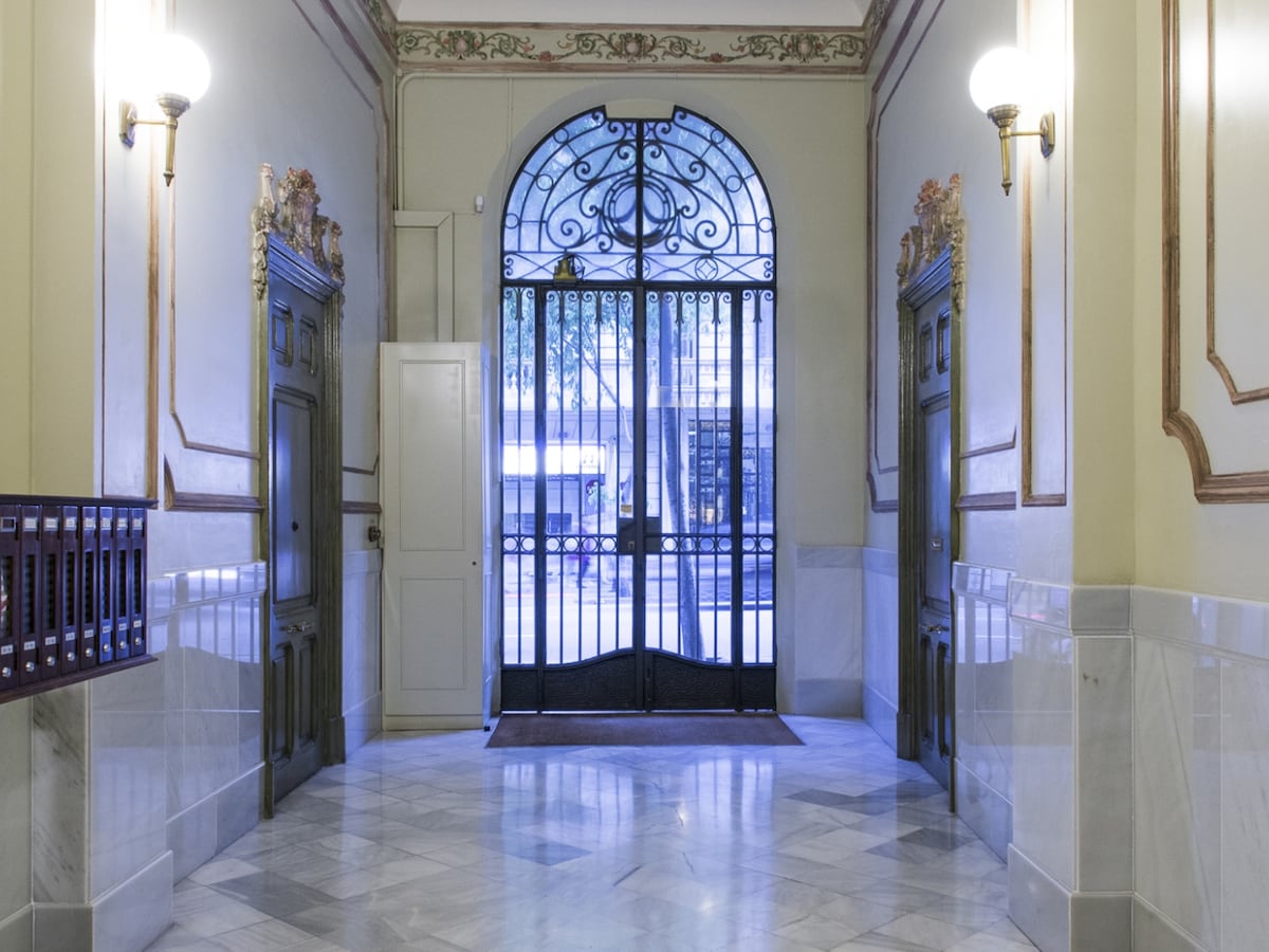 87 square meters 5th floor building 2 lifts All-day consierge services. Residential building 2 bedrooms; one very spacious doble with built-in wardrobe, privacy balcony with excellent views over Barcelona modernists arquitectire en-suite bathroom And a single rooom ideal for guest or home office Fully equipped kitchen Prime location Easy Connections to airport Walking distance to sans train station. 2 metro stations “ plaza España “ and “ rocaford” one street away