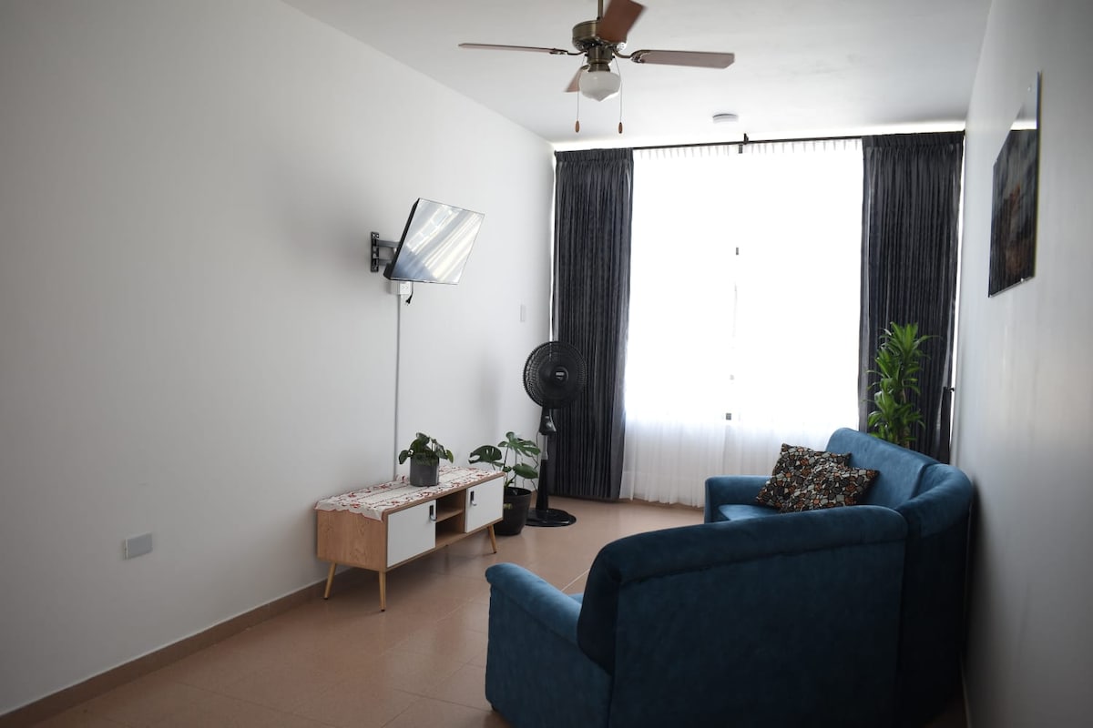 Falleg íbúð með loftkælingu staðsett gott Guadalajara hverfi í Buga.. einkabílastæði, þar eru 3 herbergi með húsgögnum, aðalherbergi með loftkælingu og svefnsófi fyrir aukagistingu. Hér er góð lýsing, stórir gluggar, vel búið eldhús, salernissvæði með þvottavél og pláss fyrir fataslá. Það er staðsett í 5 mínútna fjarlægð frá Basilica of the Lord of Miracles, þar er stórmarkaður, apótek og bestu veitingastaðirnir í kring.