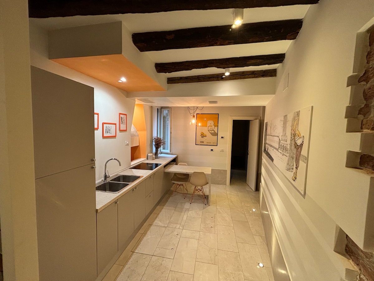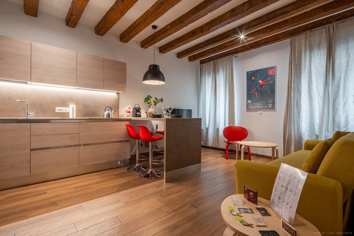 Íbúðin er inni í kirkjunni sem heitir "Chiesa di SAN GIOVANNI ELEMOSINARIO" ein elsta kirkjan á Rialto svæðinu sem byggð var á 11. öld, eina kirkjan bjargaði frá eldi sem braust út á 15. öld og fyrir 1700 hafði hún orðið hús prestsins. Íbúðin er alveg uppgerð og er í 2 mínútna göngufjarlægð frá Rialto-brúnni. Það hefur 2 svefnherbergi, stóra stofu með fullbúnu eldhúsi. Baðherbergið er með sturtu með krómmeðferð. Loftkæling, þráðlaust net og upphitun.