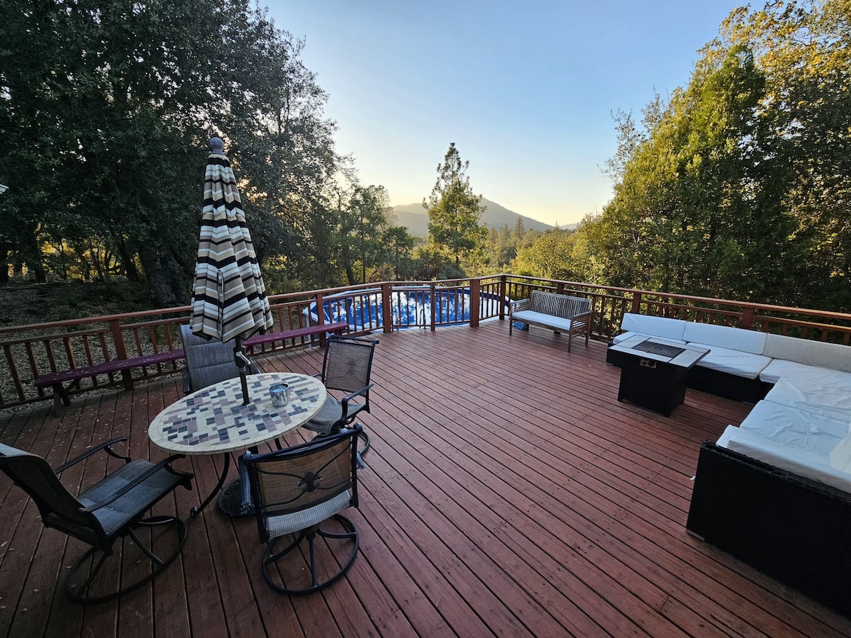 Welcome to our boho chic oasis! - 3 bedrooms, sleeps 9 - Stylish interior with wood stove - Pool, hot tub, outdoor shower - Boccie ball, corn hole court - Stunning mountain views - Outdoor kitchen, fire pit - Game room, pool table - Local attractions: Yosemite National Park, Bass Lake - Complimentary amenities available - Host nearby for assistance