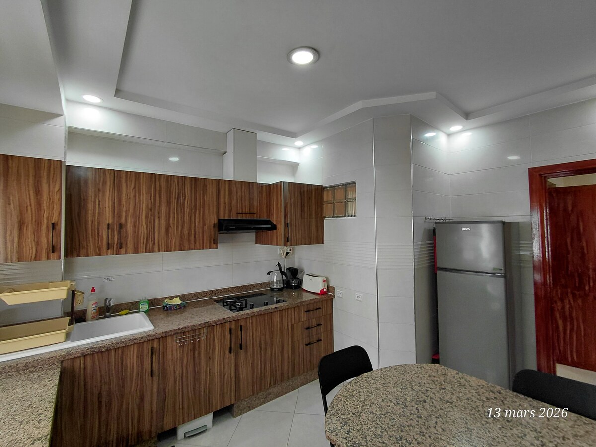 Frábær rúmgóð og heil íbúð staðsett í miðbæ kenitra með góðu útsýni yfir sebou vatnið, nálægt öllum þægindum ( veitingastöðum/matvöruverslunum). Samanstendur af stórri stofu með sófa og borðstofu, sjónvarpi og loftræstingu ásamt þráðlausu neti í boði. Þú finnur einnig 2 svefnherbergi, baðherbergi og vel búið eldhús án þess að gleyma kaffisvæði með nespresso-kaffivél. Þetta er friðsæl íbúð með góðum nágranna í rólegu og öruggu hverfi.