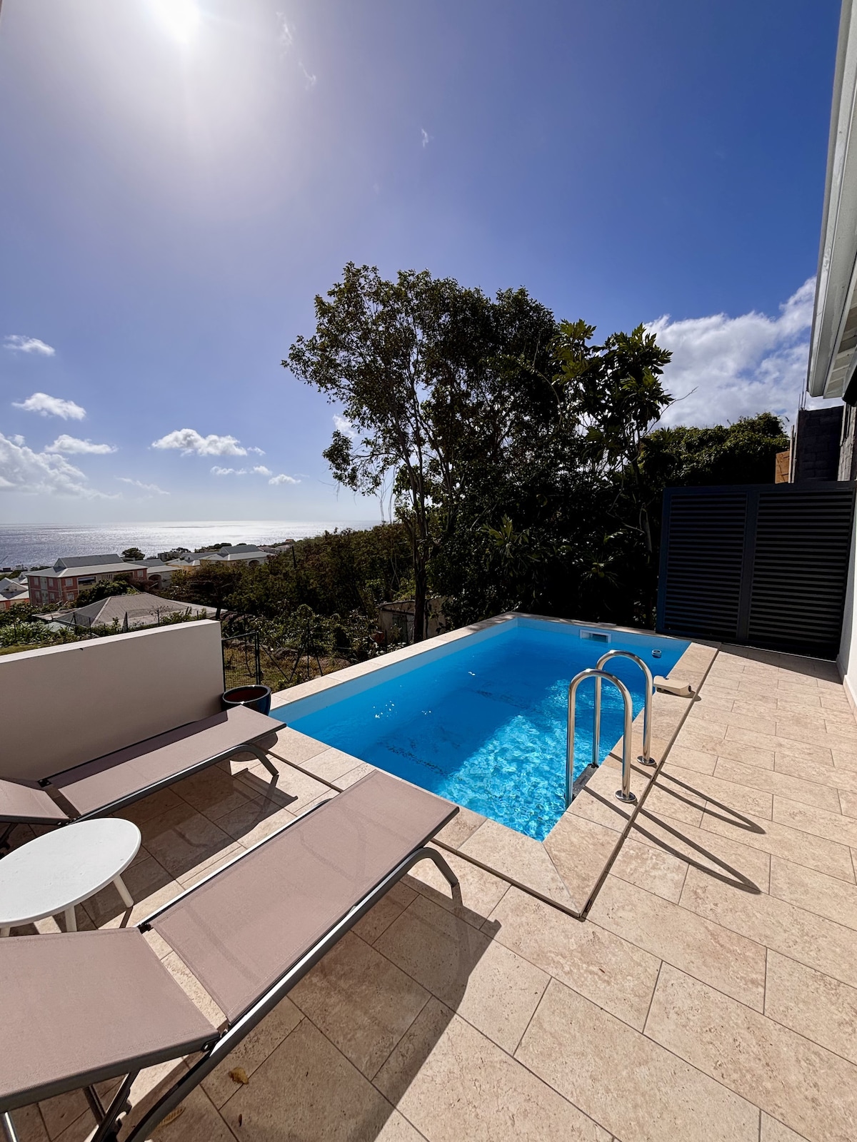 Þessi mjög góða lúxusíbúð neðst í villu er 38 m2, hún er innréttuð (viðar- og náttúrustíll) og í kringum hana er 700 m2 garður. Einkasundlaug og sameiginleg sundlaug, viðar- og náttúruskreytingar, rúm, svefnsófi, Net(þráðlaust net), fullbúið eldhús, þvottavél og 60 m2 útiverönd. Þú verður nálægt mörgum stöðum fyrir gönguferðir, þar á meðal þeim tveimur þekktustu: Soufriere og Carbet Falls. Staðurinn er rólegur og afslappandi og þú munt kæla þig niður á kvöldin.