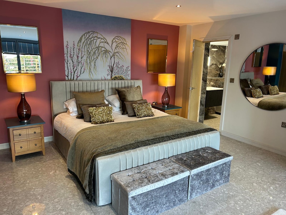 Njóttu viðbyggingarinnar sem er hluti af húsinu í afslappandi sveitaumhverfi. Ásamt þægilegu King-rúmi og stóru en-suite sturtuherbergi og wc. Hér er sérstakt eldhús/borðstofa, bjálkastofa með notalegum brennara, snjallsjónvörpum og frábæru útsýni. Eiginn aðgangur að verönd að framan og á neðri hæðinni er wc. Sameiginlegur miðstigi með eigendunum. Stórir garðar með verönd og þægilegum sætum utandyra. Matur með hlaðborði. Eigið bílastæði. Frábærar göngu- og hjólaleiðir, A1 og M1 í nágrenninu.