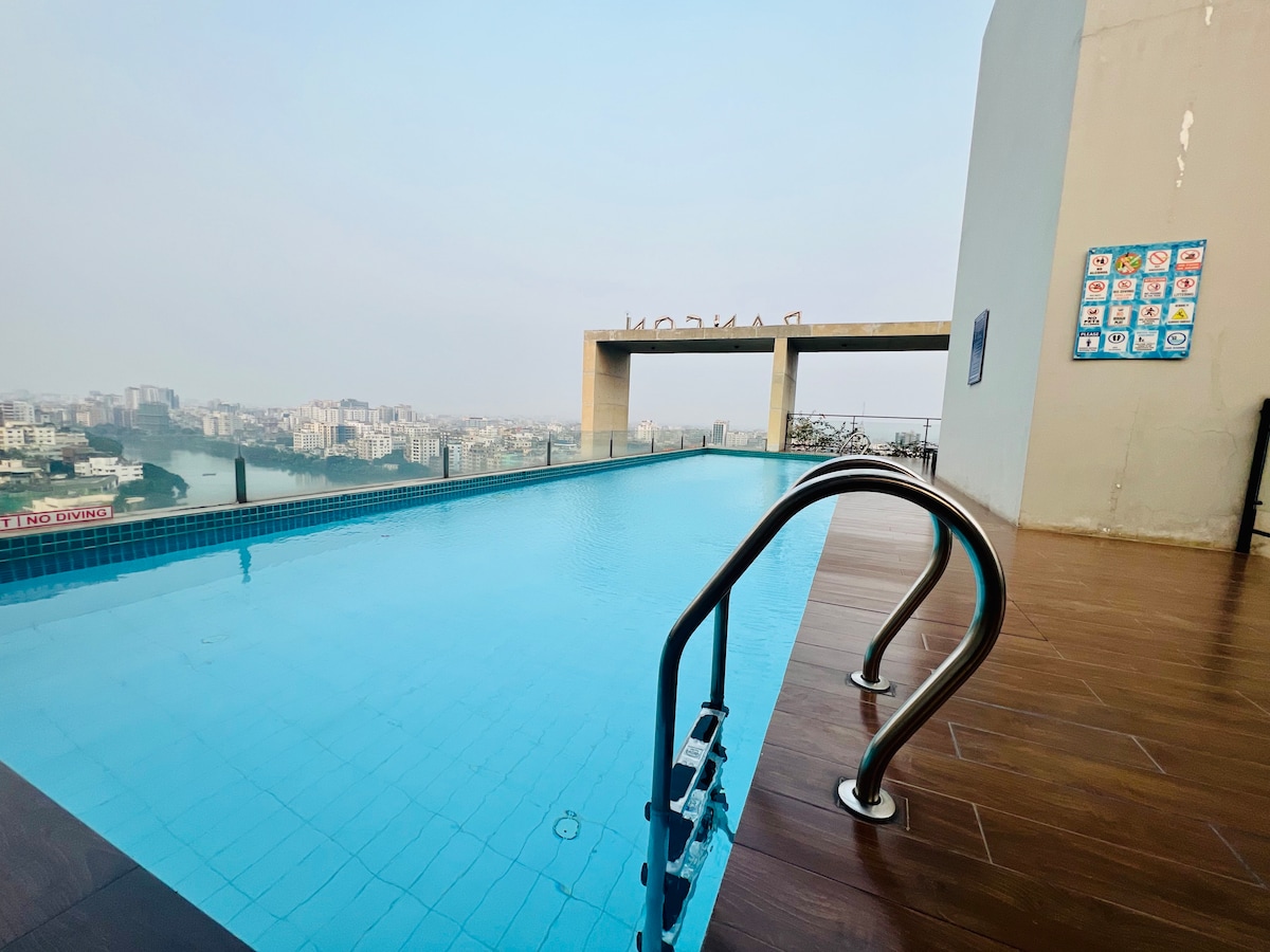 1 bedroom with queen bed, 1 living room with sofa bed, 1 bathroom, 1 Balcony, barbecue corner, spa treatment, a hot tub and fitness center are available. Fitted with air conditioning, 4K smart TV, Refrigerator, microwave oven, fire extinguisher ball. Bathroom is equipped with hot water shower. Apartment located in the Bashundhara residential area, just 20 minutes drive from Hazrat Shahjalal international airport. Swimming pool, Laundry and restaurant service.On-site car parking is free.