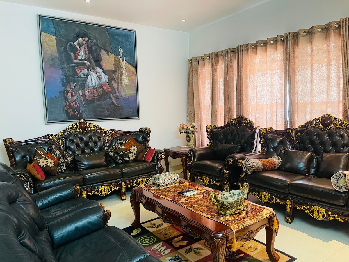 Þetta er vel upplýst og nýlega innréttuð stór íbúð. Það er svo nálægt helstu VIP svæðum eins og flugvelli, Diplomatic Zone, Banani og Gulshan. Vel viðhaldið ræstingakerfi . Það er innréttað af 3 Deluxe-rúmum í 3 herbergjum, með loftkælingu í öllum herbergjum, snjallsjónvarpi með þráðlausu neti, ísskáp, örbylgjuofni, vatnshreinsiefni, þráðlausu neti allan sólarhringinn, sófum, lestrarsvæði, eldunarvörum, matarsettum, rúmfötum, handklæðum, teppum o.s.frv.