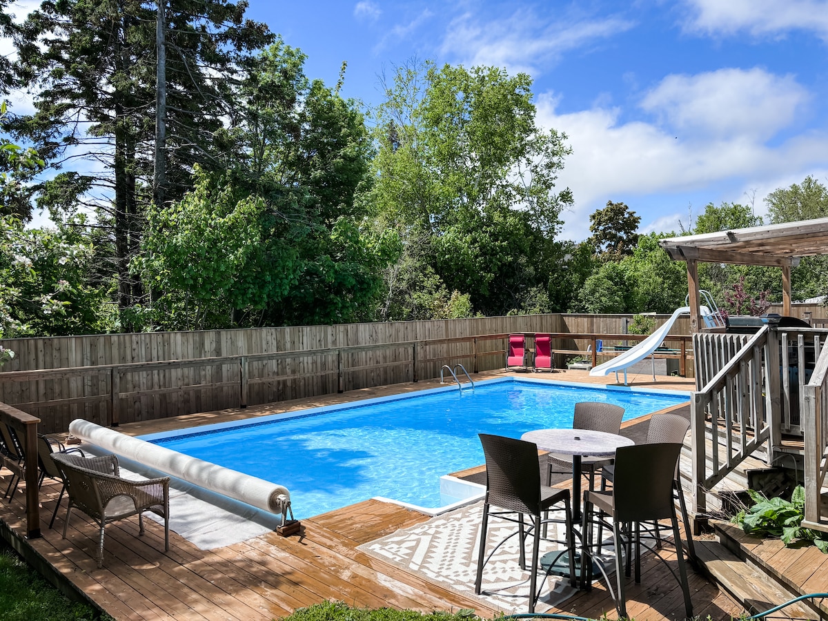 Rúmgott heimili innandyra og út! Stórt eldhús, borðstofa og stofa með fallegu sjávarútsýni. Njóttu þess að horfa á hafið úr svefnherbergjunum líka! Útivist fylgist með glæsilegu sólsetrinu yfir vatninu frá SUNDLAUGINNI eða stórum, hlöðnum framþilfari. Í bakgarðinum er gaman að grilla eða s'ores á Fire-pit! Gakktu að versluninni Corner til að taka út eða drekka áfengi, aðeins 3 hurðir niður. Crystal Crescent Beach er í aðeins 5 mínútna akstursfjarlægð frá húsinu. Garðurinn er fullgirtur fyrir hugarró með börnum og gæludýrum.