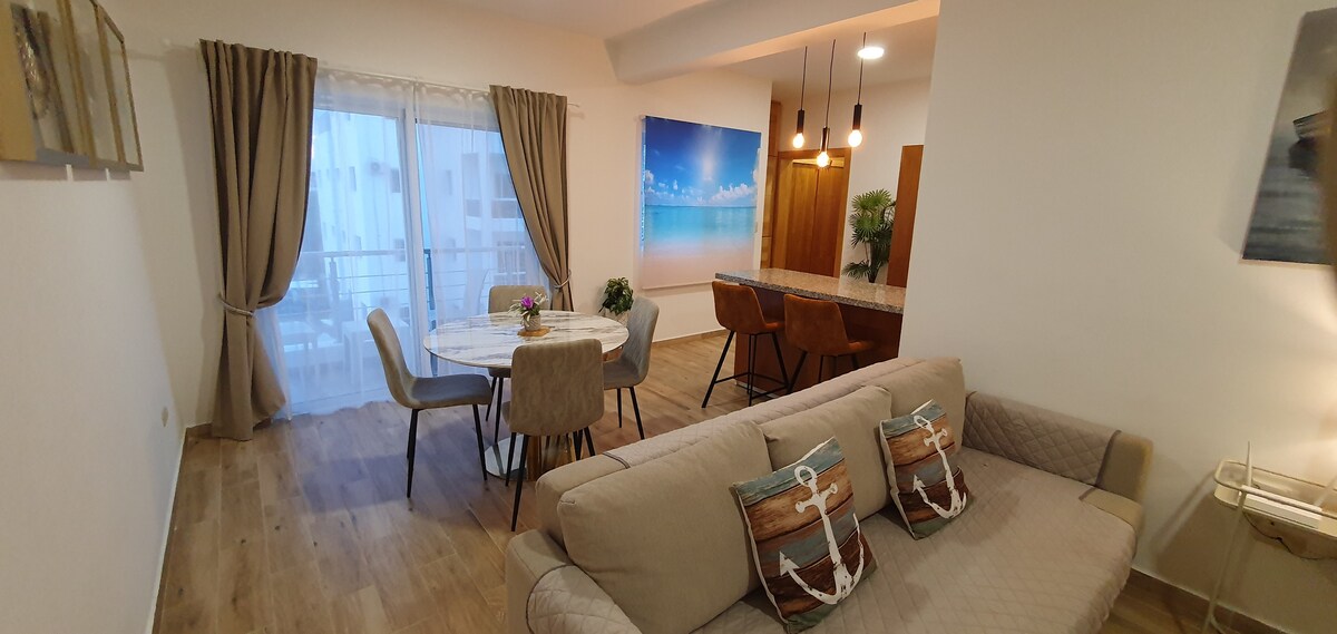 Þessi 70m2 íbúð, staðsett í 7 mínútna göngufjarlægð frá aðalströndinni, glæsileg og örugg, hún er fullkomin fyrir pör og fjölskyldur með 1 eða 2 börn. King size rúm sem er 2 metrar og loftkæling í rúmgóða herberginu. Þægilegur svefnsófi og loftræsting í stofunni. Heitt vatn og þvottavél. Það er staðsett í hinu fræga þorpi Bayahibe. Í 700 metra fjarlægð frá ströndinni. Þorp, verslanir og veitingastaðir við sjóinn eru í 5 mínútna göngufjarlægð. Skemmtilegt og innréttað sundlaugarsvæði.