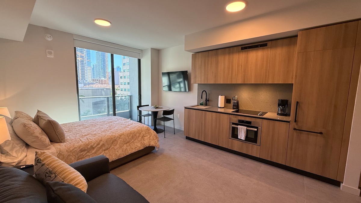 Modern studio in Downtown Miami, perfect for up to 4 guests. It features 2 queen-size beds, a sleek bathroom, and a fully-equipped kitchen. Enjoy stunning city views from the private balcony, and take advantage of the in-unit washer/dryer, Wi-Fi, and TV. The building offers access to an elevated, heated pool, hot tub, fully-equipped gym, and a workspace for business travelers. Ideal for both relaxation and productivity, this luxurious space is your perfect Miami retreat. Book now!