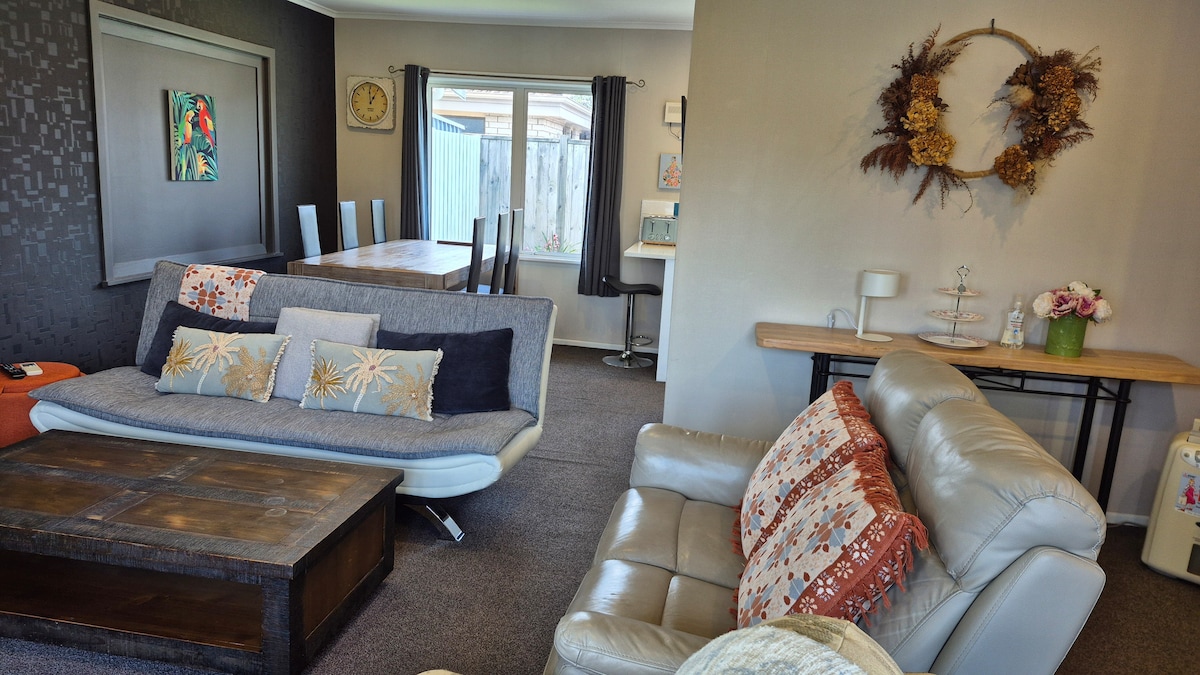 Komdu og slappaðu af í friðsælum, tvöföldum bílskúr í úthverfum sem er vel staðsettur við ströndina á staðnum, Bayfair-verslunarmiðstöðina, Baywave-sundlaugina og vinsæla Mount Maunganui Beach og Mercury Baypark. Vinalegir gestgjafar eru á staðnum og geta mælt með kaffihúsum og veitingastöðum. Fallegu hundarnir okkar, Olly og Stella, fá klapp. Aukagámaherbergi sem er aðeins í boði fyrir bókanir fyrir 3 gesti eða fleiri. Viku- og mánaðarafsláttur gildir. Nýlega bætt við hitaplötum og útigrill í boði sé þess óskað.