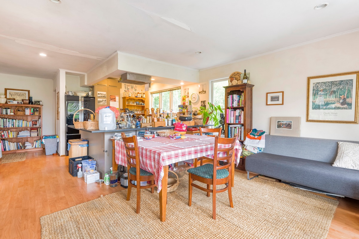 1950's Bungalow in the village. Classic and Cosy. Wonderful outdoor spaces to sit around and chat with friends - truly unique! 2 minute walk to Cafes, Bar, Takeaways and other interesting little shops. Close to Bus Stop that will take you to the City or if you prefer a short walk to the ferry for a trip to popular Hobsonville to check out the exciting cafes, bars and Farmer's Market or directly to the City. I provide guests privacy, but am only a phone call or message away. Very handy location!