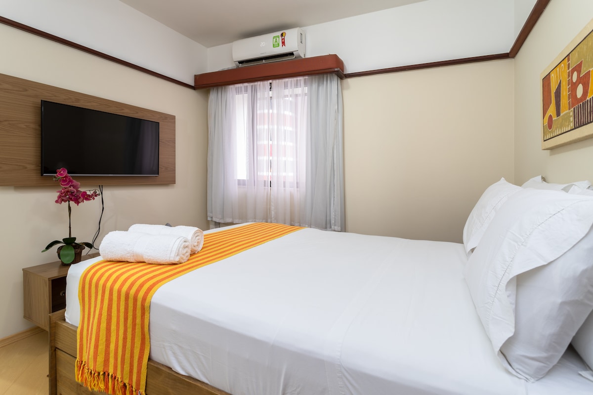 Njóttu þessarar ótrúlegu einkaíbúðar inni á Hotel Quality Suites Oscar Freire: - Hefðbundin há rúmföt; - Rúm af queen-stærð; - Aðstoð við eldhús (engin eldavél); - Þráðlaust net; - 32'' sjónvarp með kapalrásum (ekkert streymi) - Þægindi til að taka á móti gestum (fer eftir dvalarlengd); - Hárþvottalögur og -næring, hand- og líkamssápa, salernispappír; - Hárþurrka; - Ferro de Passar; - Saumur á setti; - Millistykki; - Central Ar.