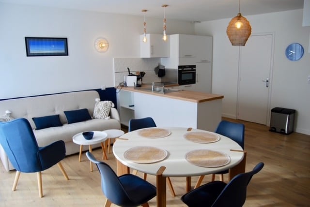 Bonjour, Bienvenue à CAP COZ Sea Side Nous vous proposons des vacances dans un cadre unique, face à la mer, les pieds dans l'eau, un appartement 4/5 personnes. Il s'agit d'un T2 duplex au deuxième et dernier étage, sans ascenseur. Au premier niveau, l'appartement est composé d'une belle pièce à vivre avec un coin repas ainsi que l'espace salon TV. il est transformable pour la nuit avec deux banquettes et un lit gigogne. La cuisine est toute équipée. La salle d'eau se compose d'une douche et WC
