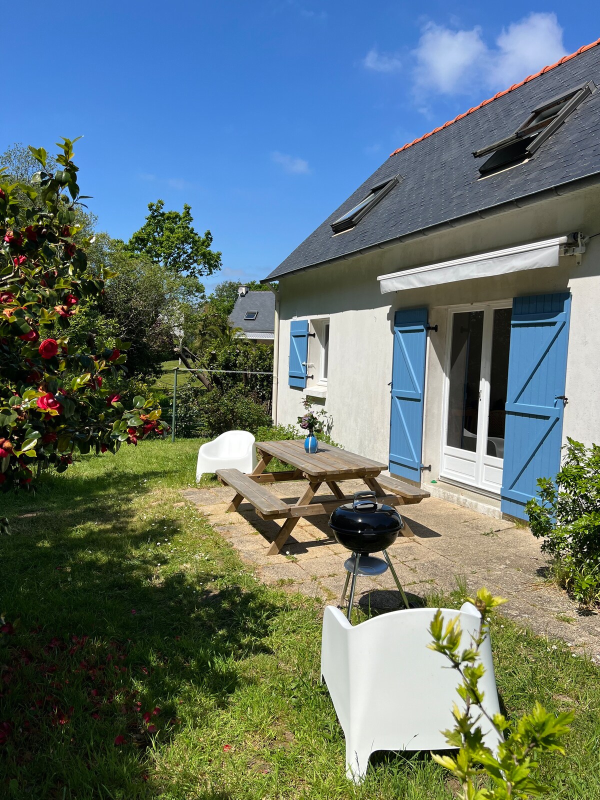 Dans un quartier calme, à 7 mn à pied des plages et à 3 mn du bourg de beg-meil, maison sur deux niveaux pour 4 personnes. Celle-ci comprend une cuisine équipée, une salle à manger, et un salon. Elle dispose de 3 chambres dont une en RDC, 2 SDB et 2WC. Un jardin avec terrasse, salon de jardin, transats, un barbecue, 4 vélos et un parking privé. Les draps sont fournis, les serviettes sont à la demande.
