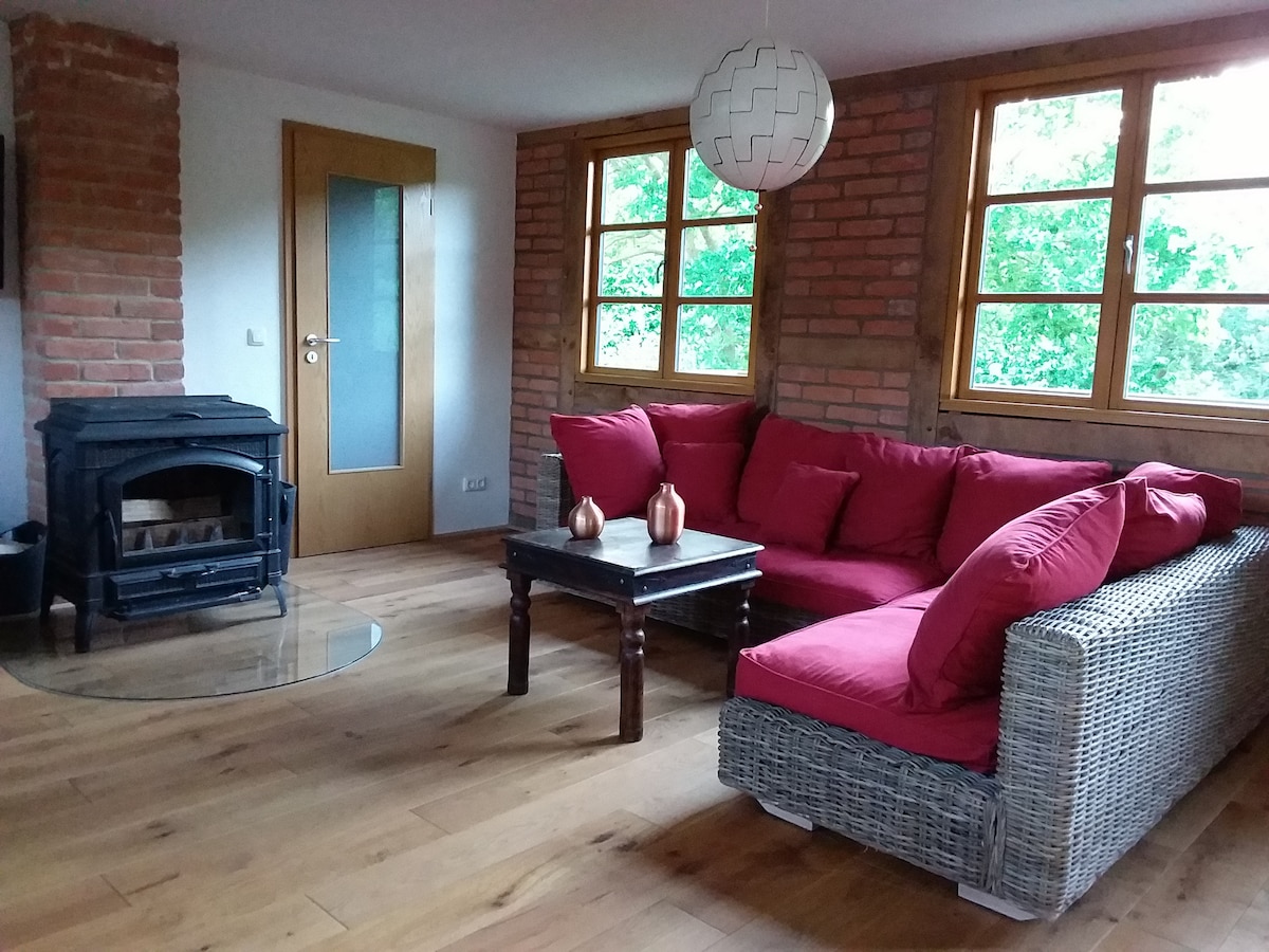 Umkringdur engjum og ökrum, földum bak við þorpstjörnina, liggur litla herragarðurinn með aðalhúsinu og gömlum hesthúsum. Síðastliðin fimm ár höfum við verið að endurbyggja það vandlega og blásið nýju lífi í fasteignina frá 1899. Á efri hæð herragarðsins – múrsteinsbygging sem er dæmigerð fyrir svæðið – bíður þín rúmgóð, björt 114 m2 íbúð. Gömlu bjálkarnir sjást enn og aftur. Innra rýmið er einfalt og truflar ekki.