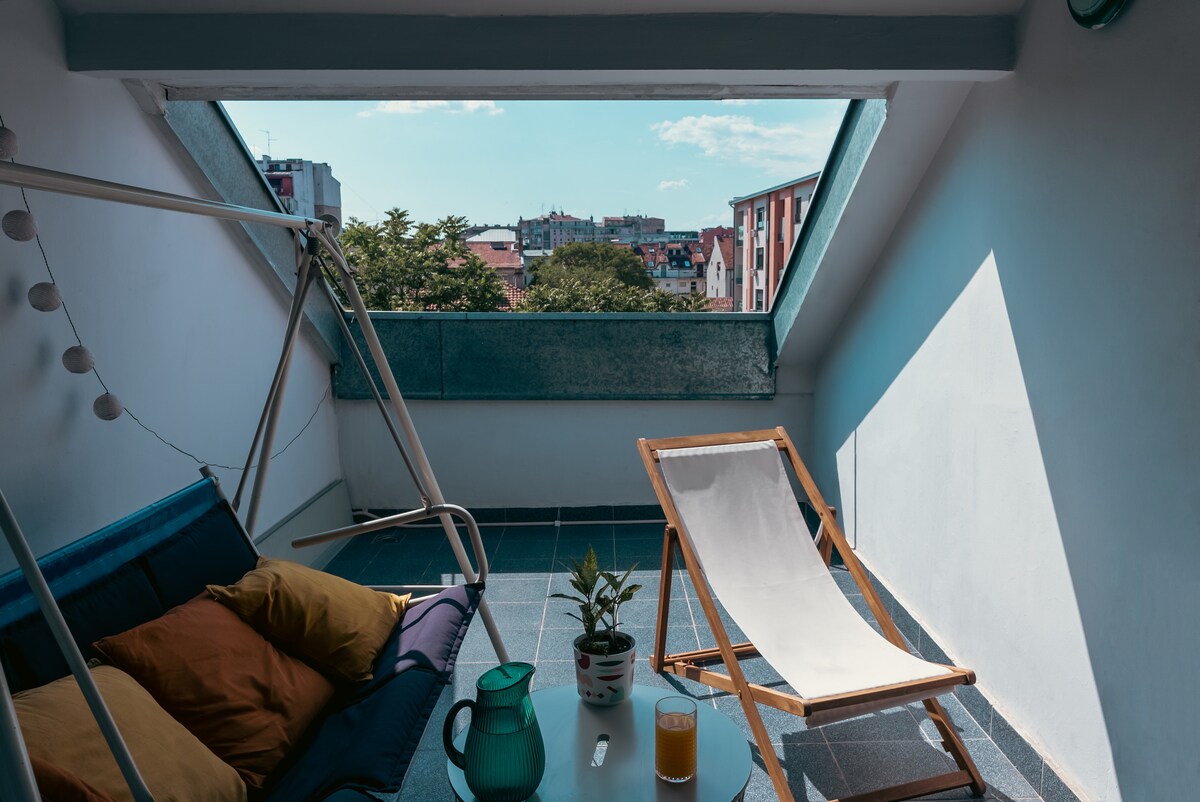 Verið velkomin í nýju, sólríku stúdíóloftíbúðina með svölum í miðborg Belgrad. Þetta rými dregur innblástur frá minimalískum og nýstárlegum meginreglum hönnunar og sýnir einstaka blöndu af opnu rými, hreinum línum og vandlega völdum efnum sem eru aðallega úr eftirtektarverðum júgóslavum og skandinavískum vörumerkjum. Þetta litla en rúmgóða stúdíó býður upp á fullkomið afdrep fyrir skammtímagistingu í borginni með mikilli dagsbirtu, frískandi grænum áherslum og skilvirku skipulagi.