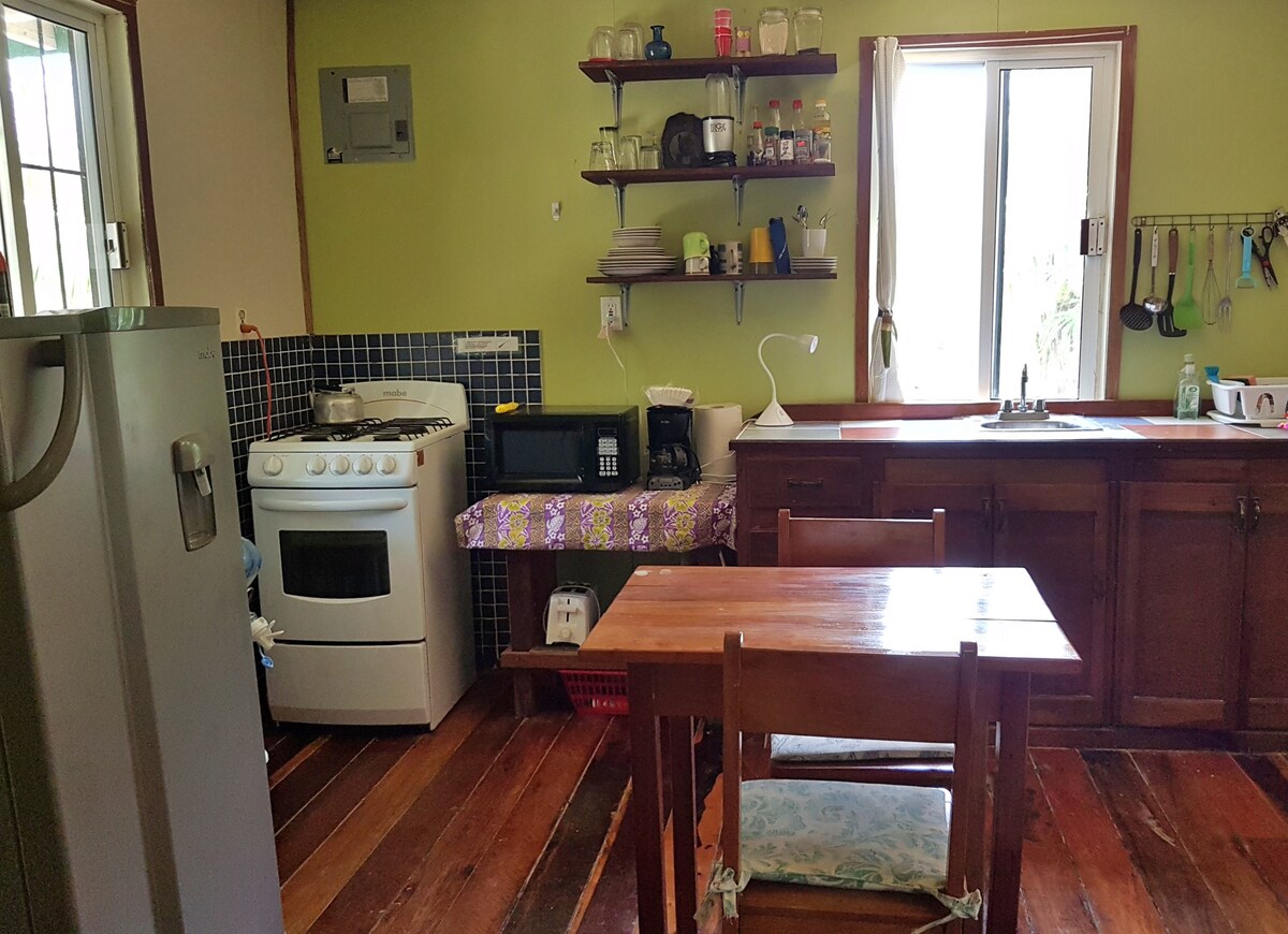 Þessi litli kofi er bjartur og svalur í rólegu íbúðarhverfi í Caye Caulker á trjánum okkar. Búin með kaffi/te aðstöðu, lítill ísskápur, A/C, aðdáandi, hengirúm, WiFi, ótakmarkað drykkjarvatn, snjallsjónvarp m/ Netflix innskráð og það besta af öllu - HJÓL innifalin! Grill og nestisborð í garðinum sem er deilt með okkur og öðrum gestum. Við erum með fimm leigueignir á lóðinni okkar. Við búum á staðnum með tveimur dætrum okkar, tveimur hundum og tveimur köttum.