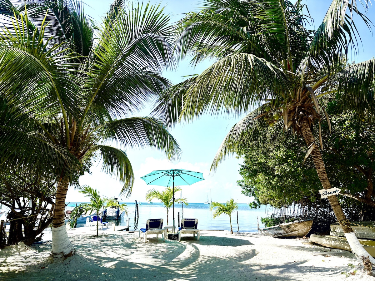 You’ll LOVE tiny house living in Paradise! 330 sq ft. of modern living with one-of-a-kind flare, charming details & amazing wading BEACH! Actual sandy BEACH- no seawall! Peaceful, safe area 4.5 miles south of San Pedro w/ a restaurant, bar & pool steps away. Dirt Road may be bumpy. Enjoy sunrise & sea breezes while relaxing in over-water hammocks. Genuine tiny house with all the amenities tucked tastefully in. A Romantic & Relaxing escape w/ adventure just waiting to be found.